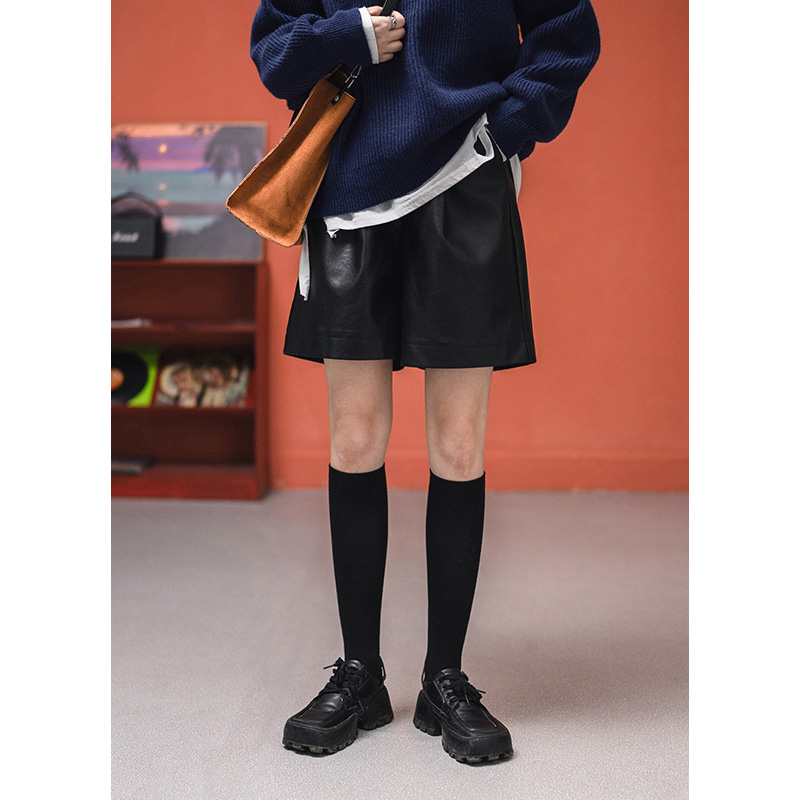 pu leather 50% pants woman 2022 summer black color display slim high waist loose Jane about wide leg casual shorts