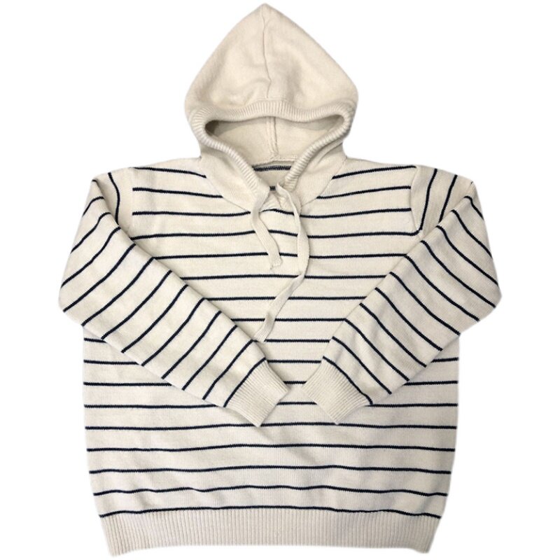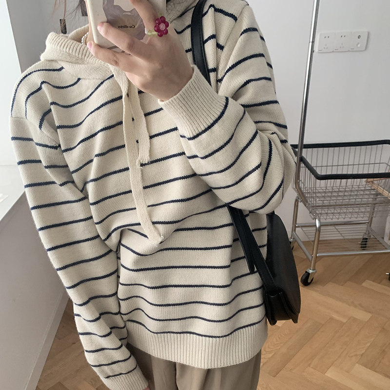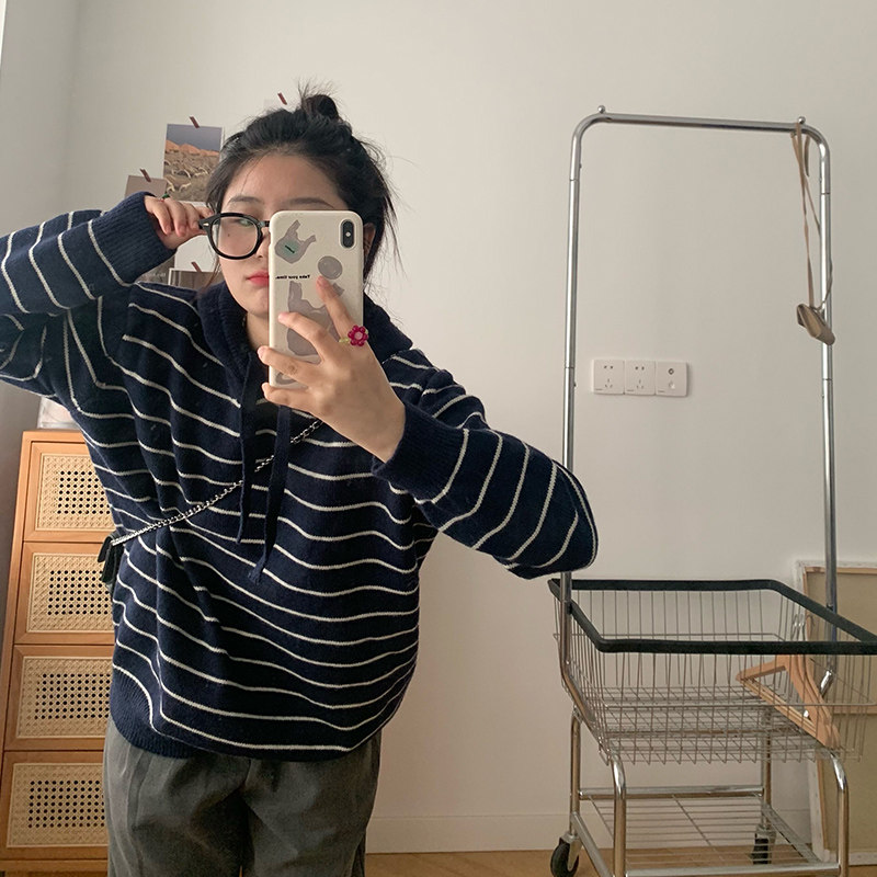 Generally cute striped hooded sweater women's 2021 new autumn and winter outer wear inner pullover Korean thin sweater