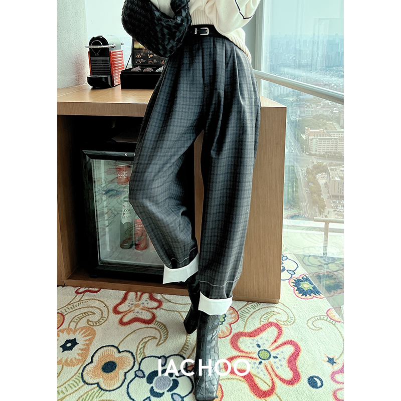 IACHOO 2022AW casual pants women can roll-edge plaid loose tapered knitted wool nine-point rob pants women