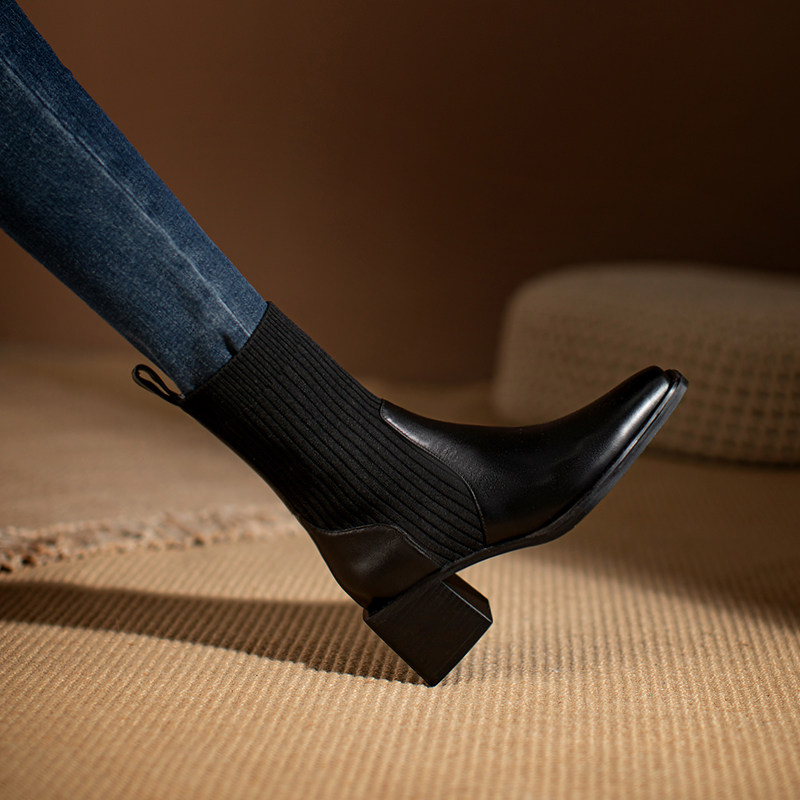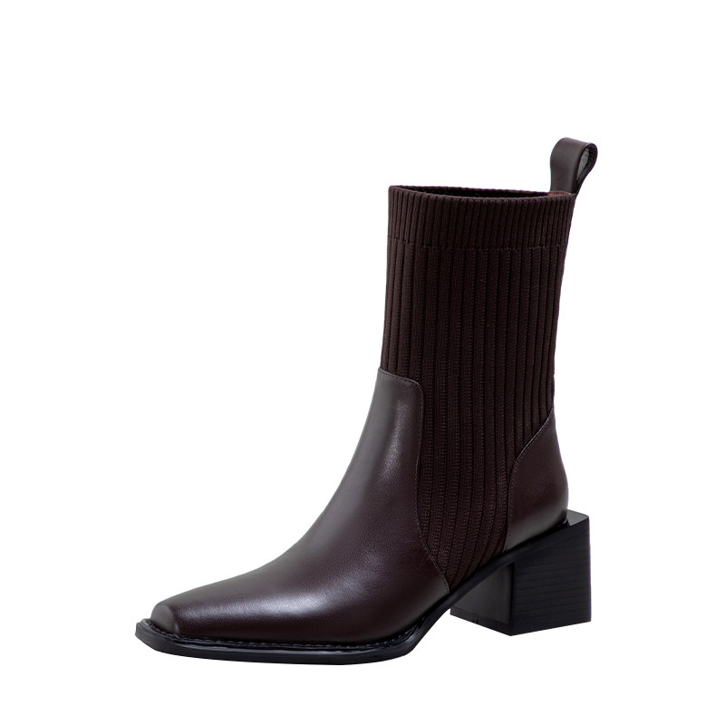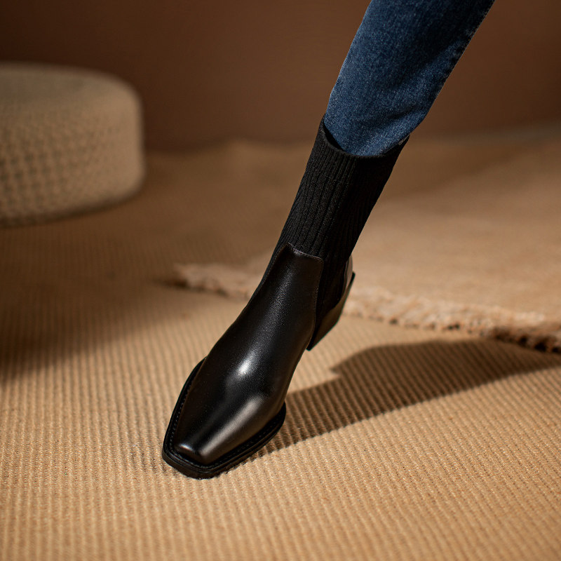 Ann it super thin ~ autumn and winter new leather thick heel ankle boots women's square head socks boots high heels 6CM