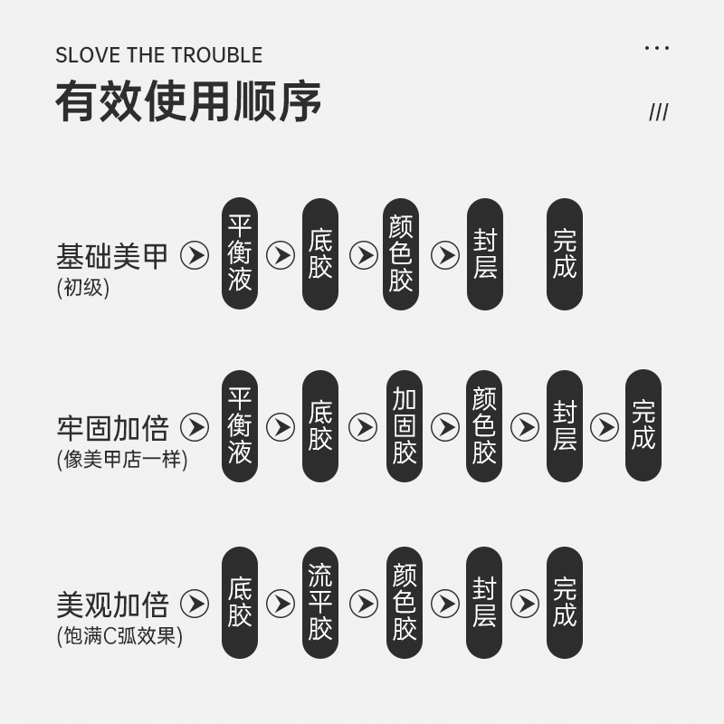 True color sealing layer (upgraded version of steel sealing layer) steel sealing layer (super bright and more durable abrasion resistant) reinforced bottom glue (anti-teething and anti-fall more persistent) Reinforced and protective glue (slightly viscous reinforcement of this nail) B2 first place