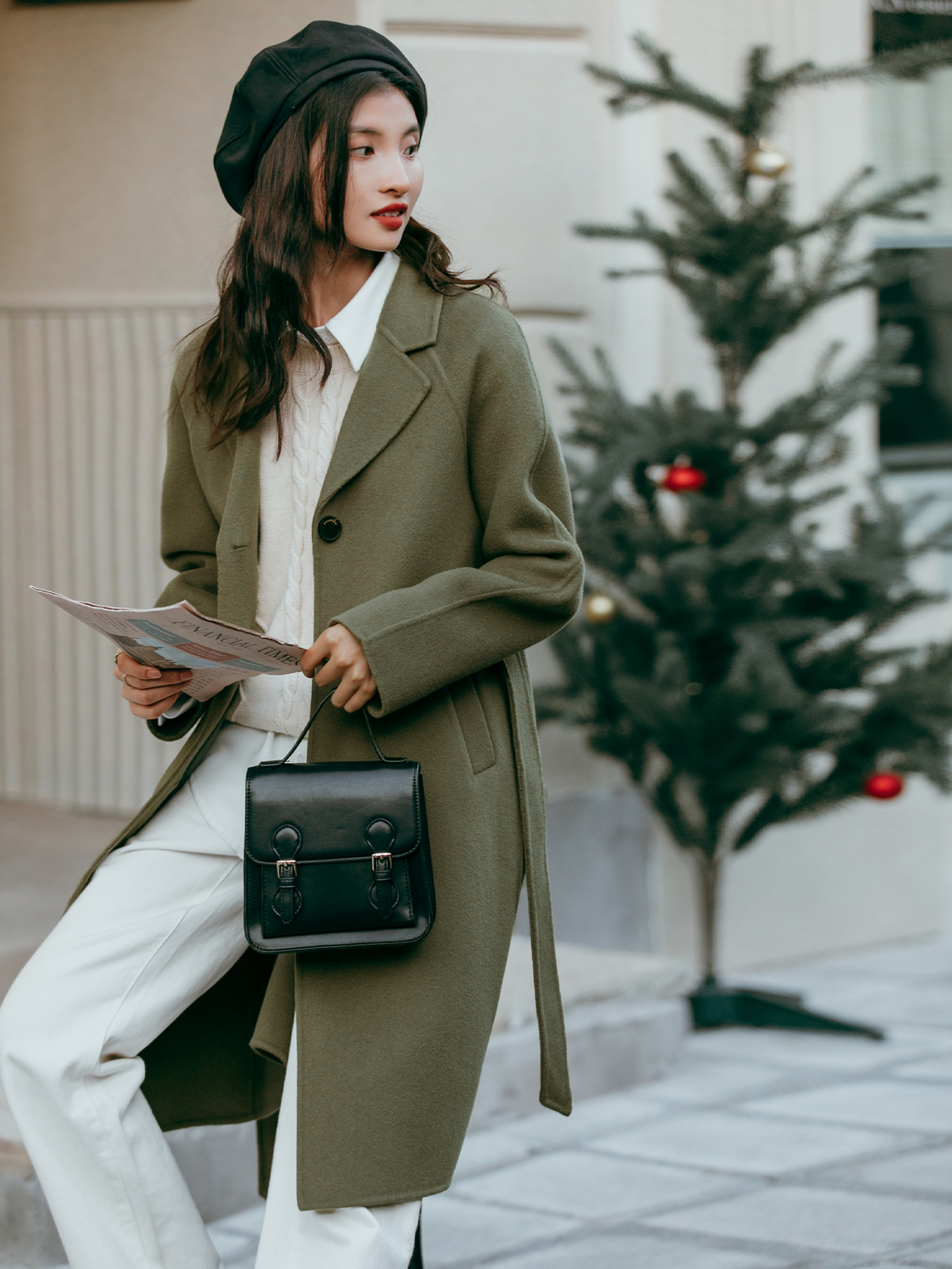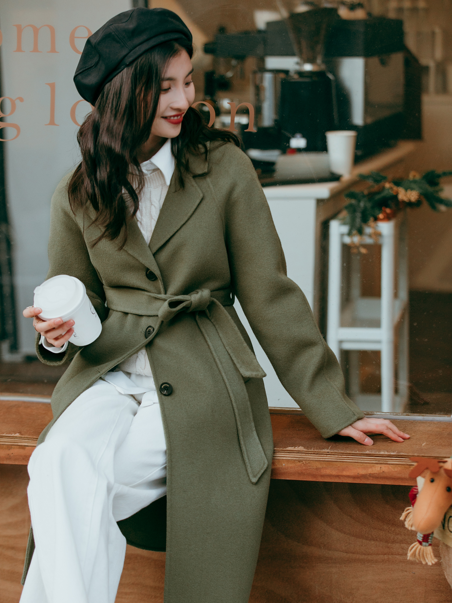 Qiquan one-cut small woolen coat female green temperament long wool double-sided cashmere coat girls 1450
