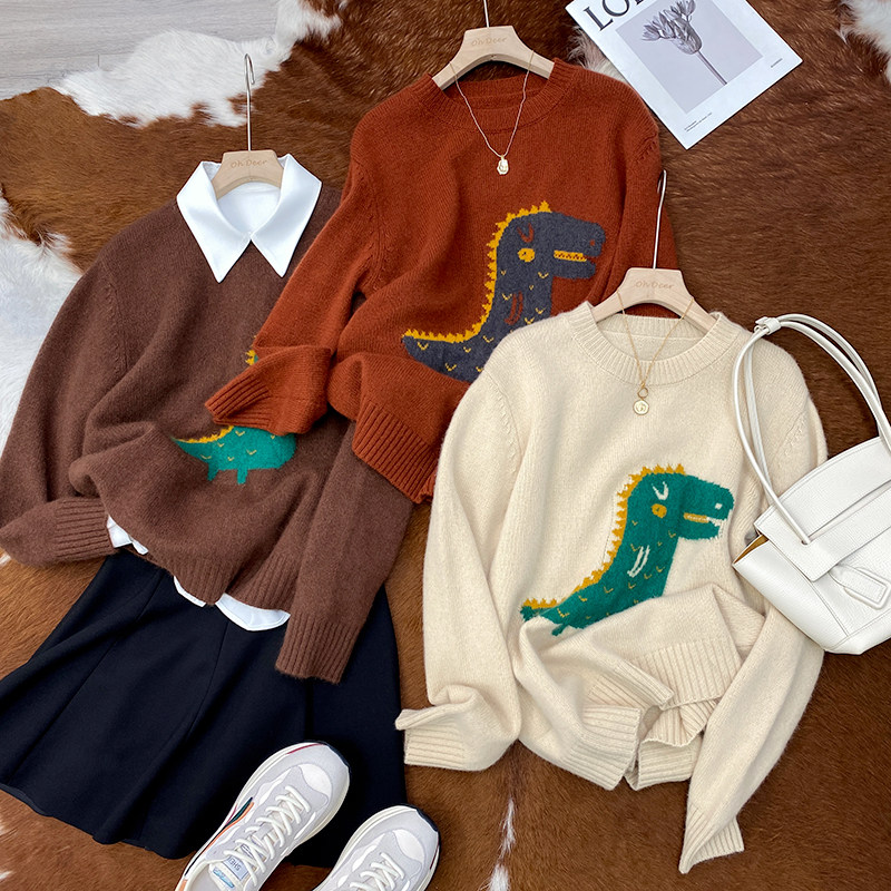 Cute little dinosaur cartoon jacquard plush raccoon hair blended loose lazy long-sleeved sweater sweater