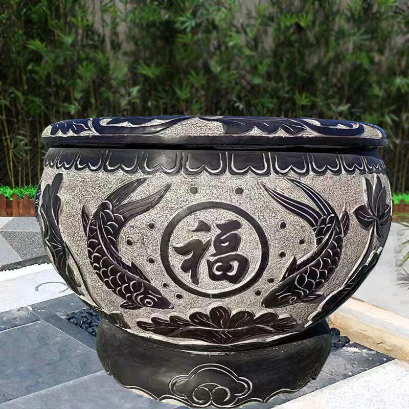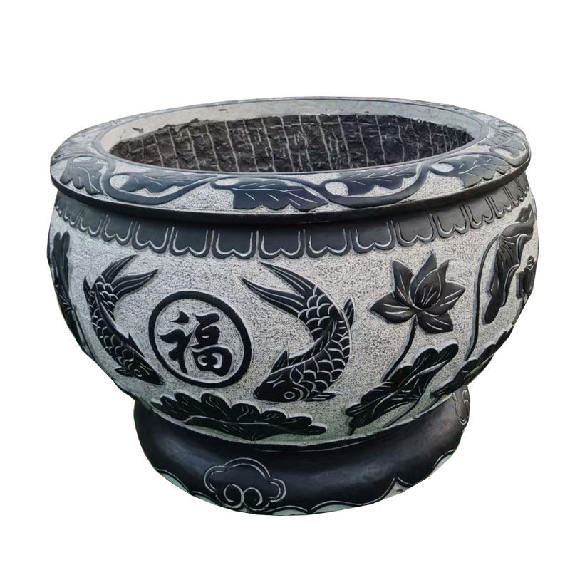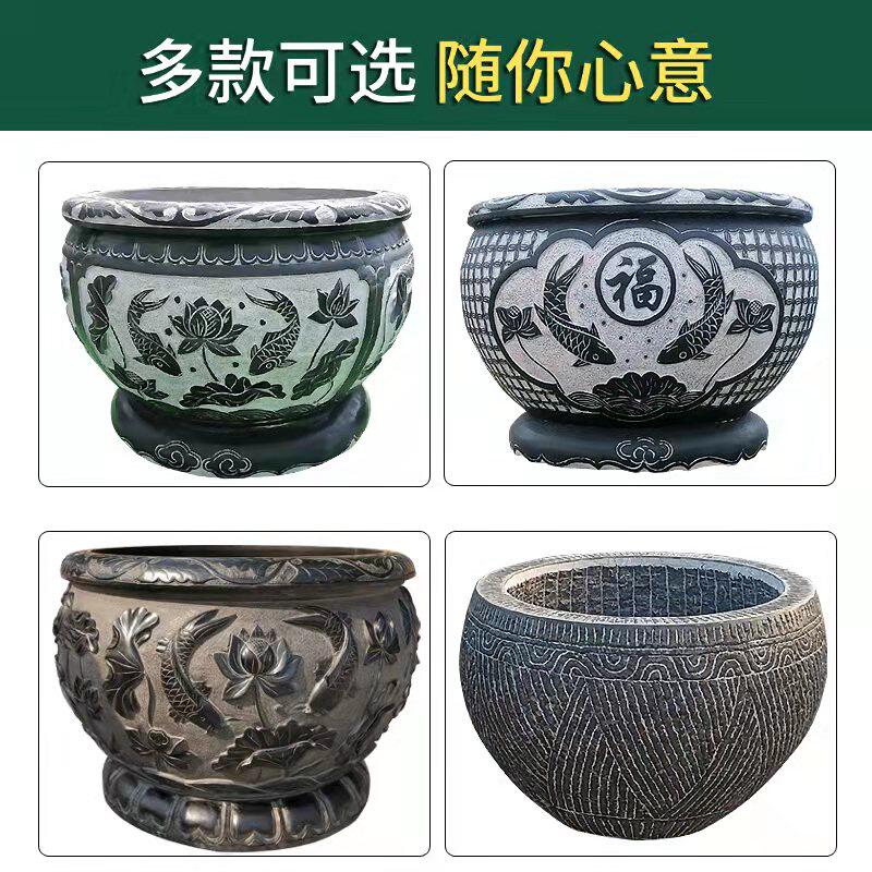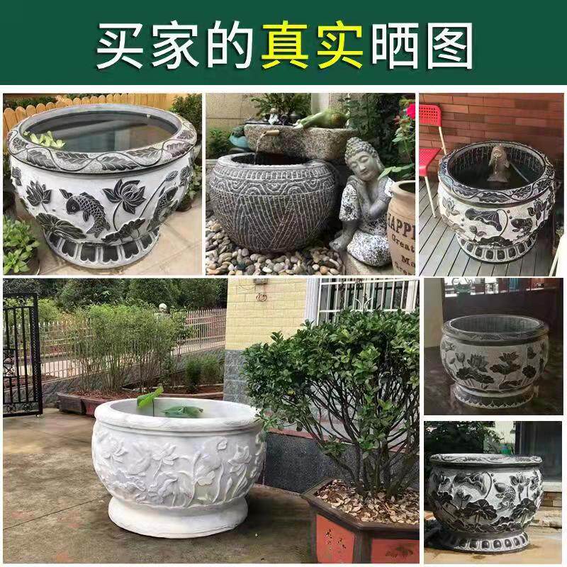 Stone carving fish tank flower pot imitation ancient green stone lotus flower cylinder courtyard fish water cylinder old stone groove round cylinder outdoor flowing water swaying piece