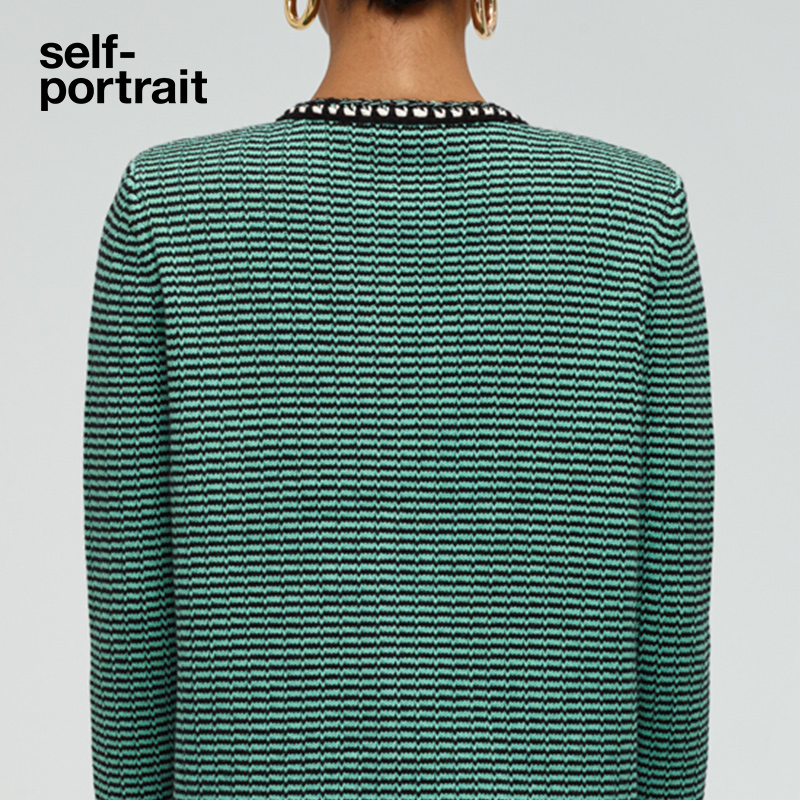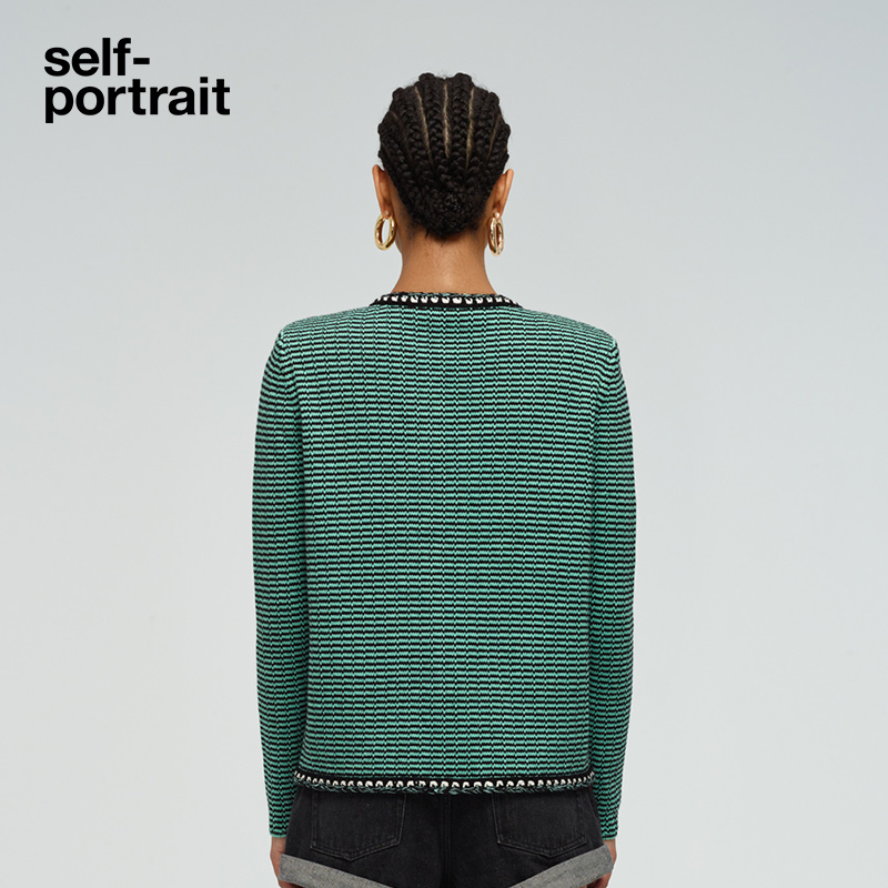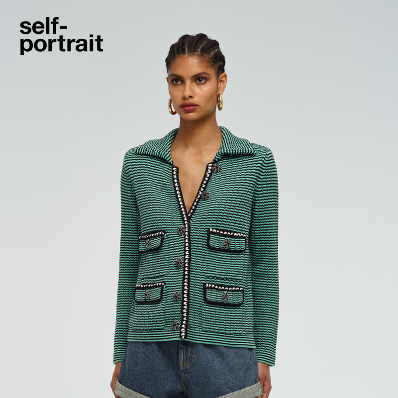 Self-portrait 2022 early spring lapel green striped knitted cardigan