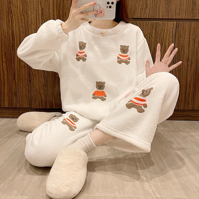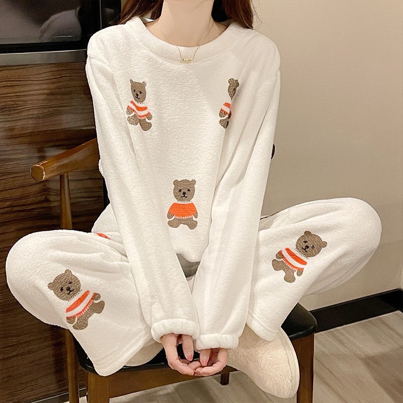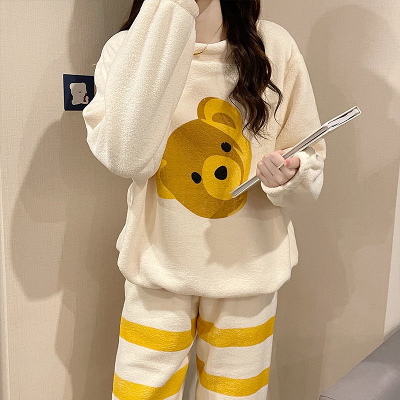 Coral suede autumn winter pyjamas woman sweet and lovely rainbow soft cotton flannel velvet round collar long sleeve long pants home clothes