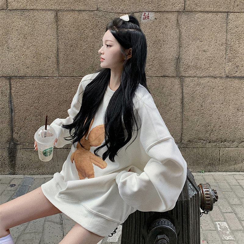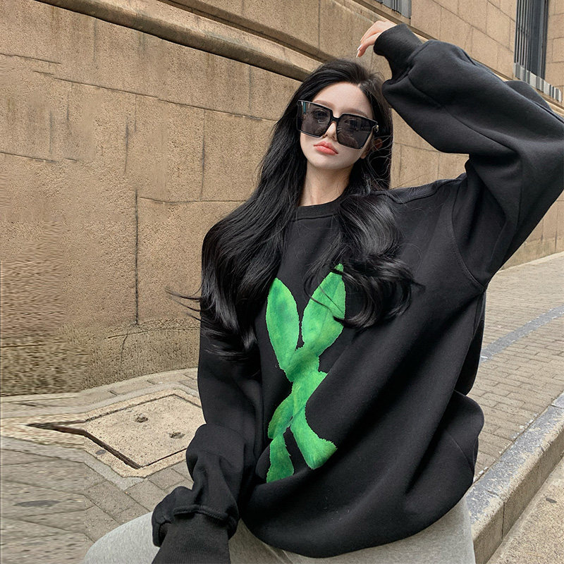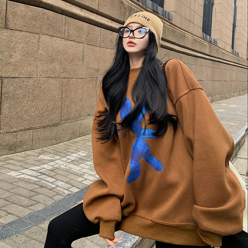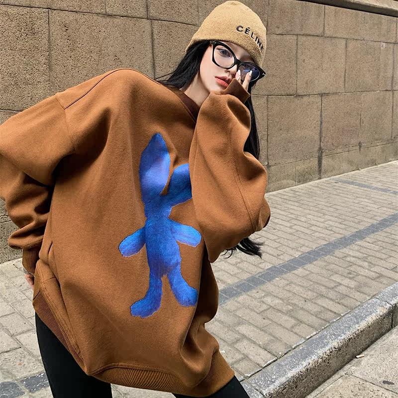 Medium and long version loose personalized printing thick cotton T women's large size ins tide brand plus velvet padded winter pullover casual jacket