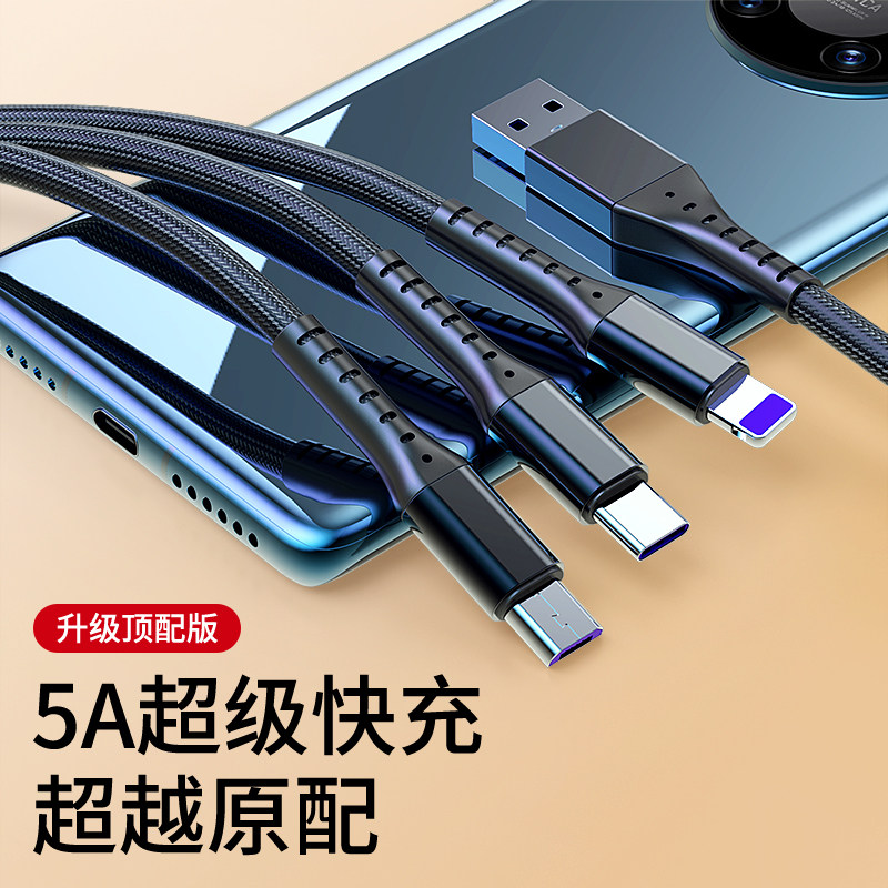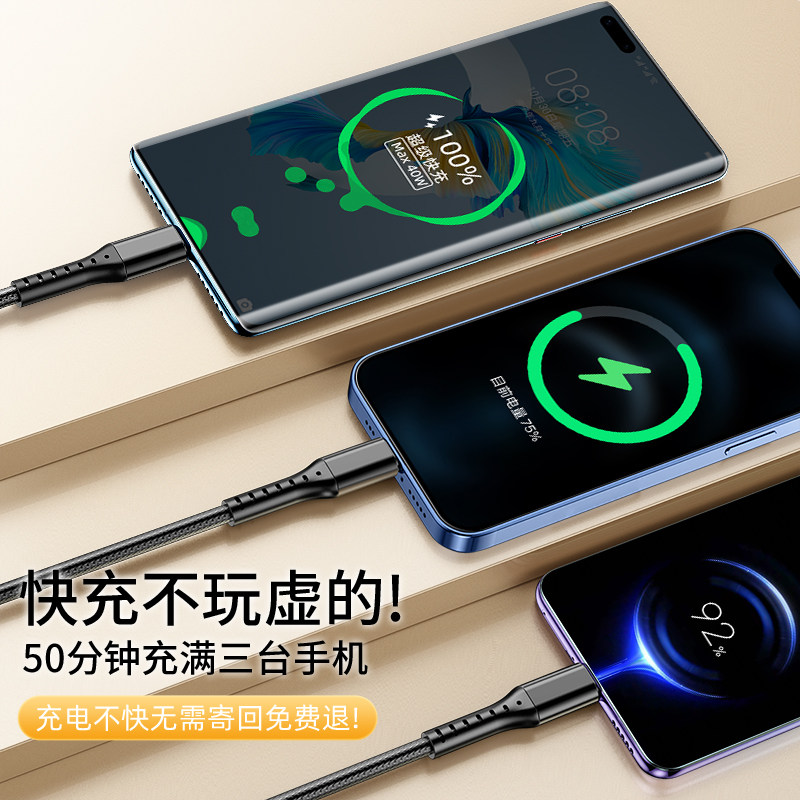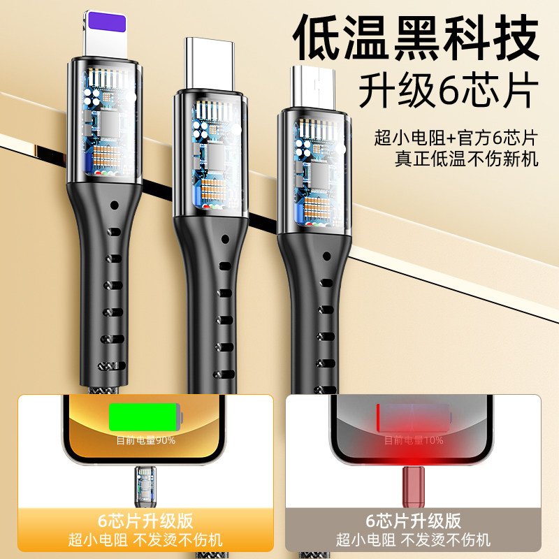 66W Super Fast Charge Three-in-one Data Wire Flash Three-head Charging Wire Flash Three-head Apple Huawei Typec iPhone 13 Mobile Vehicle Vehicle for 1-point 3