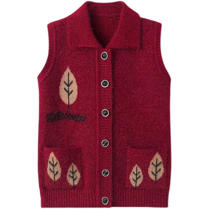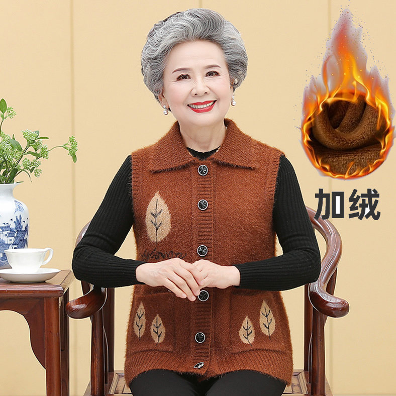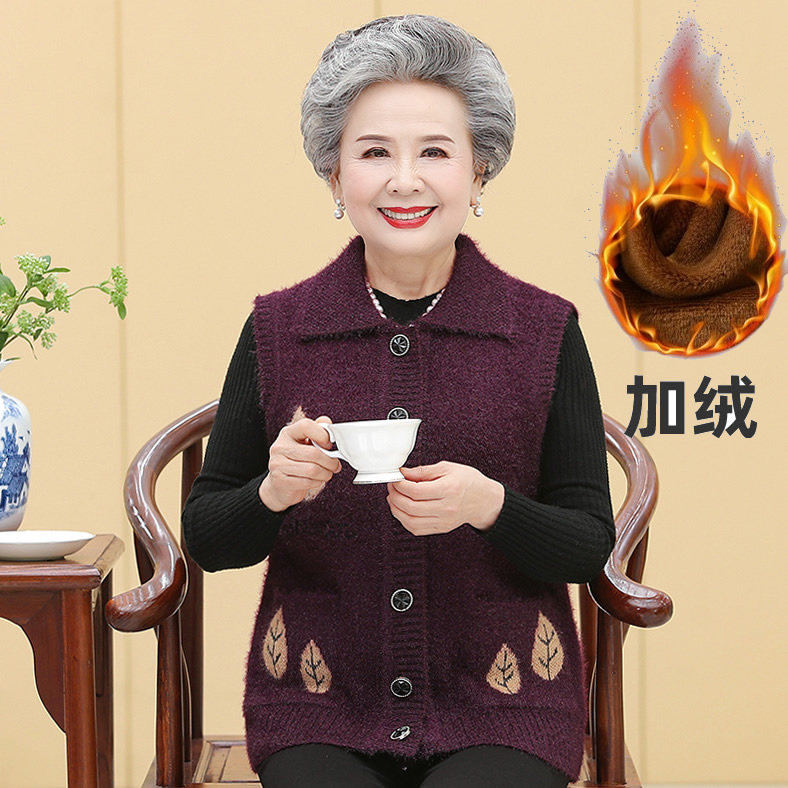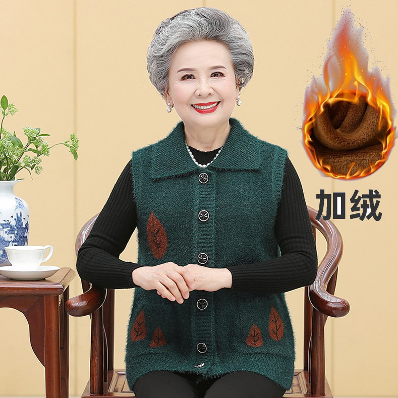 Middle-aged and elderly warm plus velvet vest female lapel grandma knitted with pocket single-row button cardigan vest vest