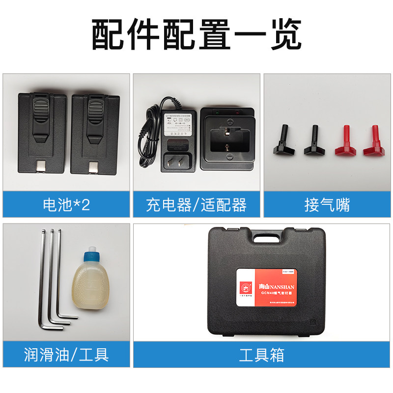 Standard configuration + two boxes of nails + two gas Nanshan GCN45 single gun head 2 electric one charge Nanshan GCN45-2 electric one charge Nanshan GCN50 high power standard Nanshan GCN50 high power 2 electric one charge Nanshan GCN50 hydropower multi-purpose 4 heads
