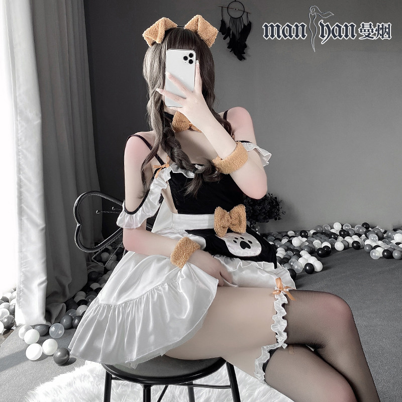 (Black and White) Cute Dog Maid Dress (Including Model Full Set) Free Model Matching Socks (Black and White) Cute Good Dog (Socks Free) Cheongsam Jumpsuit (Black and White) Cute Good Dog (Free Delivery)