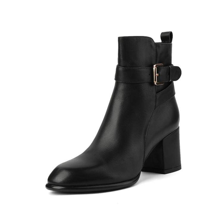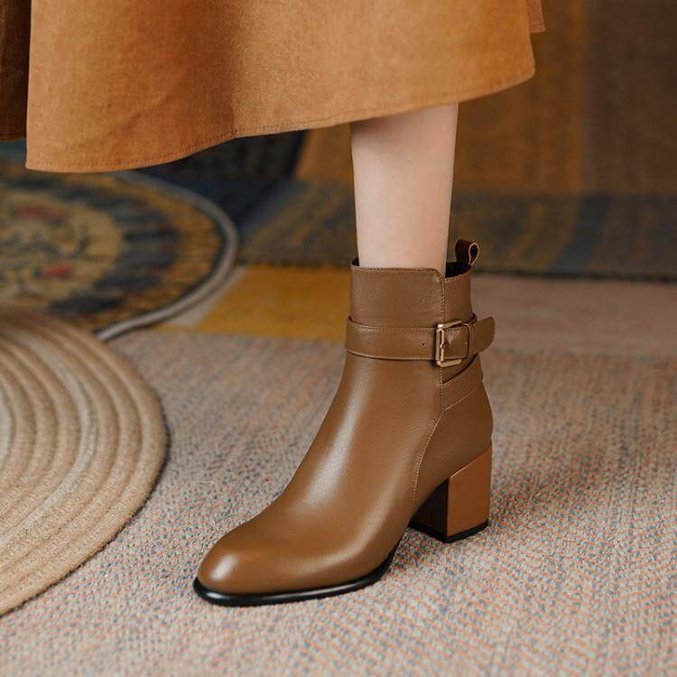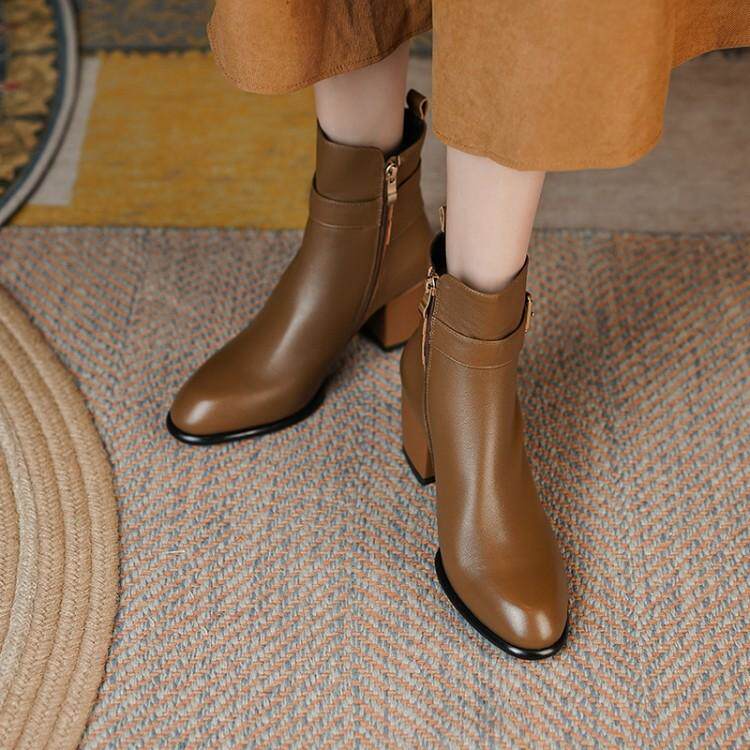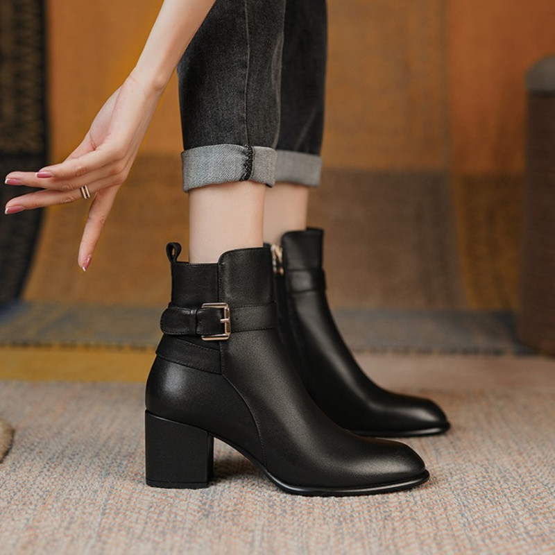 Ann it goddess recommended ~ round toe side zipper thick heel short boots women's new leather high-heeled Martin boots 6CM