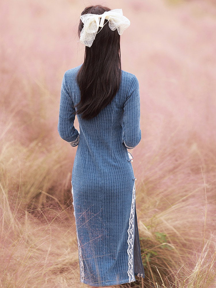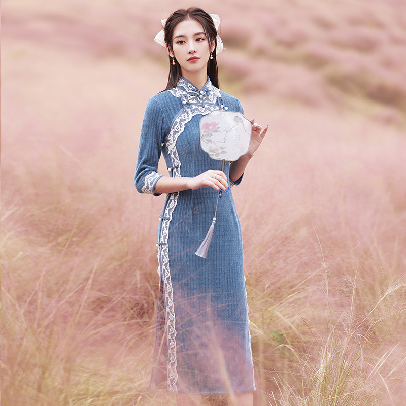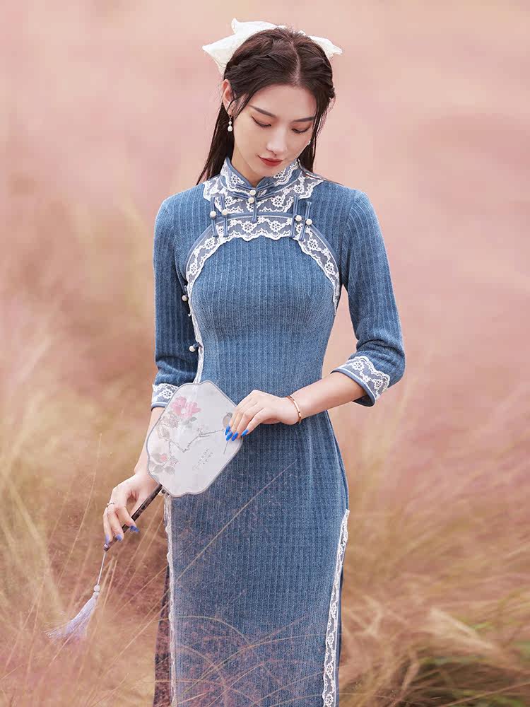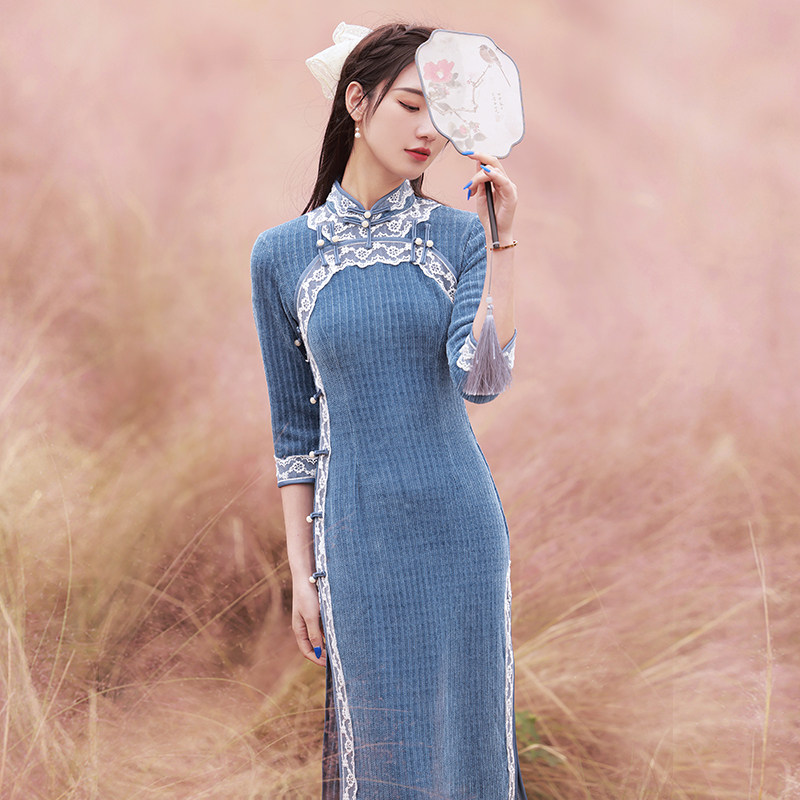 Improved Qipao 2022 New Advanced Senses Young HIGH-END TEMPERAMENT BLUE KNIT LONG VERSION RETRO FOREIGN DRESS