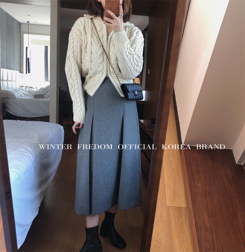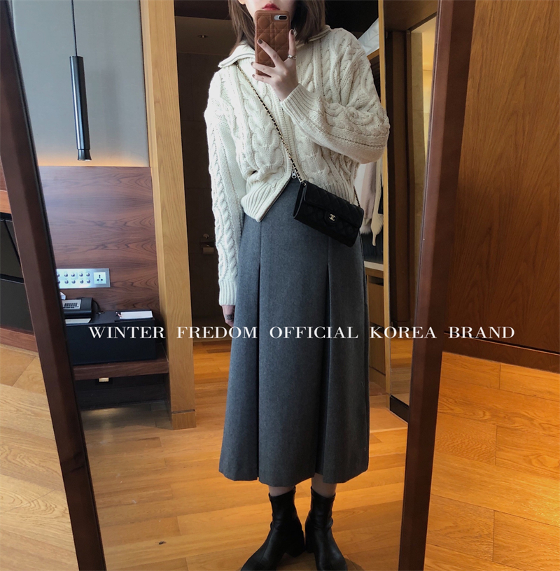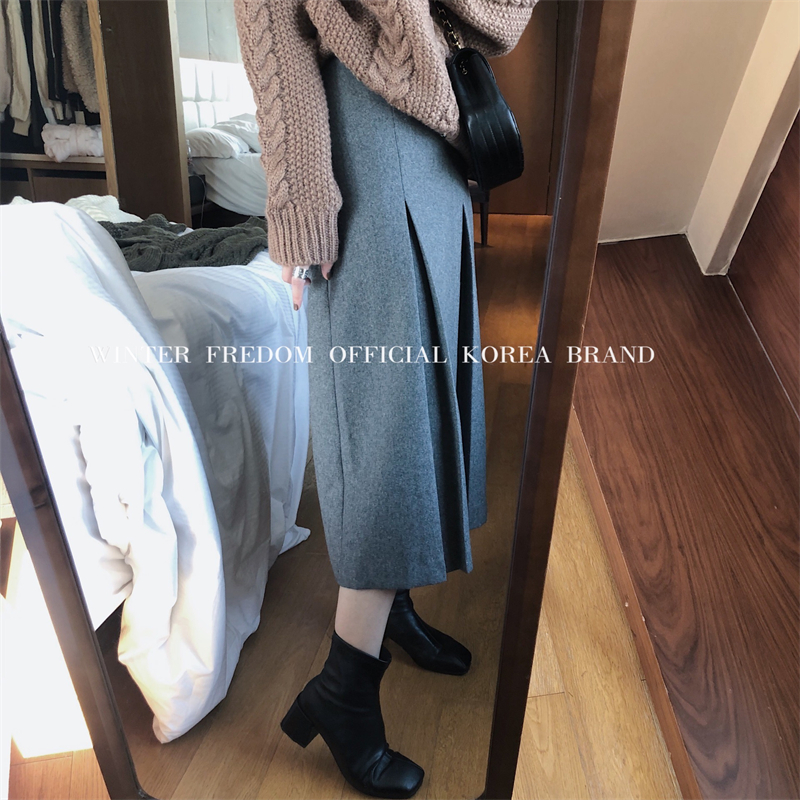 FREDOM gray woolen skirt 2021 winter new high waist straight pleated a-line skirt design sense