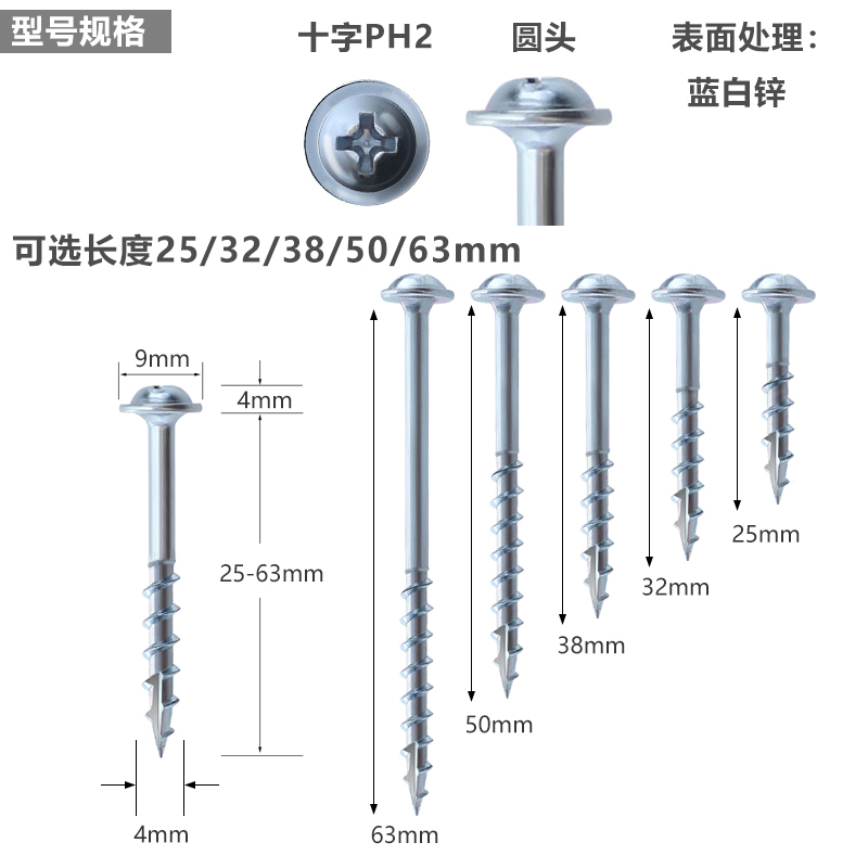 Boxed cross PH2 round head screw 25-63mm anti-rust woodworking inclined hole half tooth self-tapping screw inclined hole device