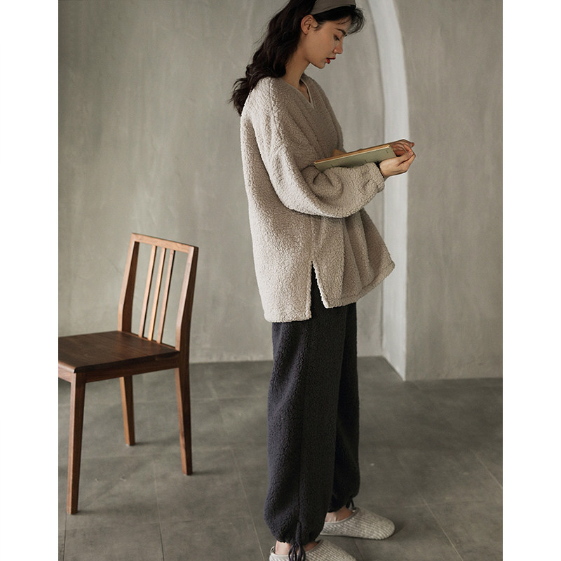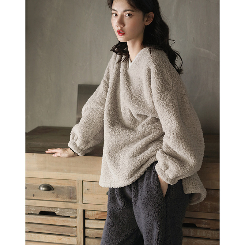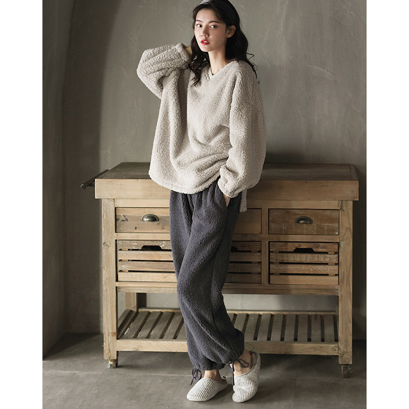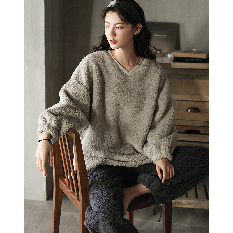Coral velvet pajamas women's autumn and winter plus velvet thickening ladies home clothes warm lamb velvet winter two-piece suit