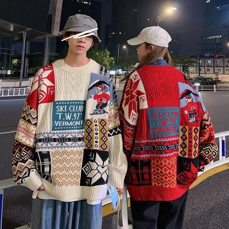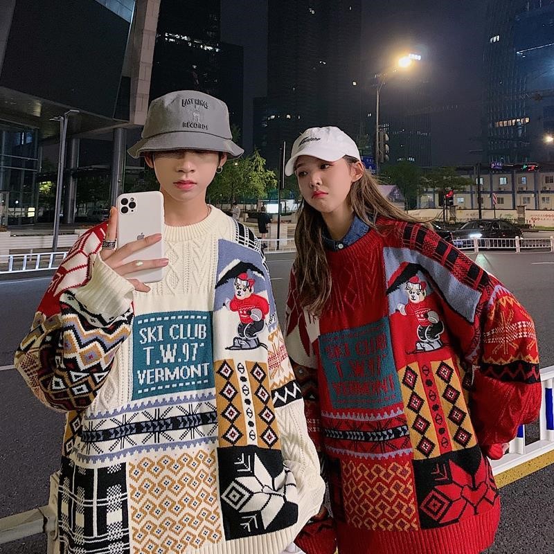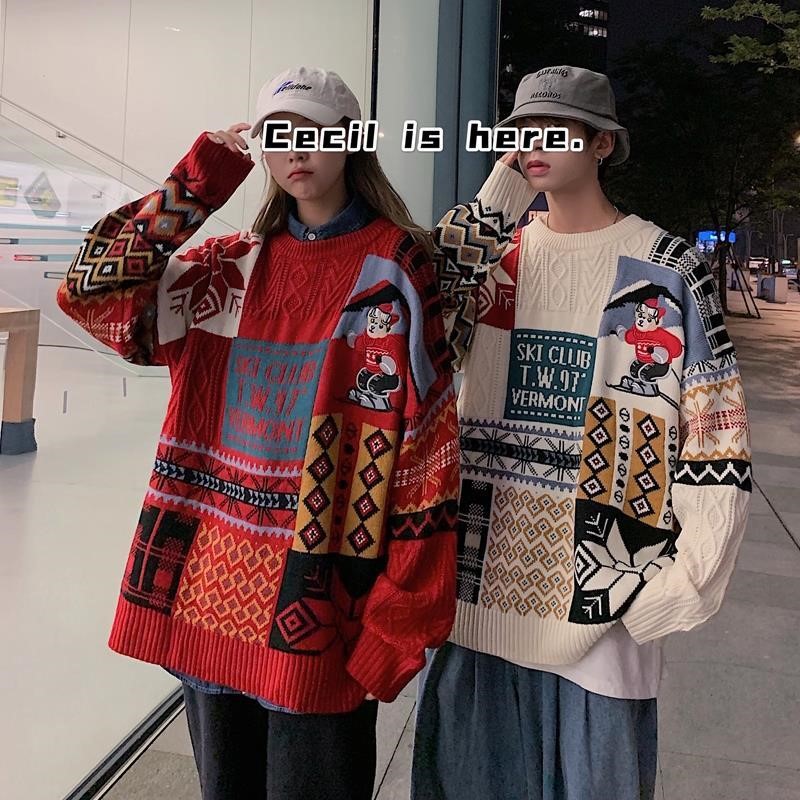 Lovers'Christmas little bear sweater men's winter small crowdthickened retro red ancient with Christmas lovers' jackets
