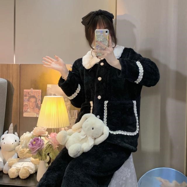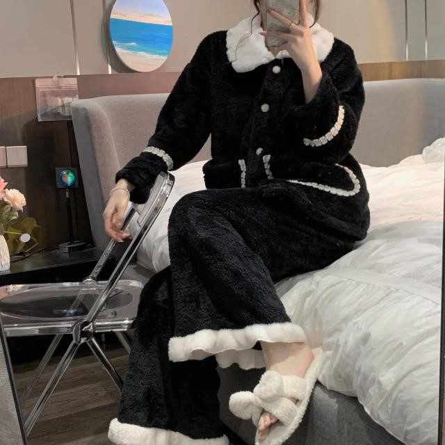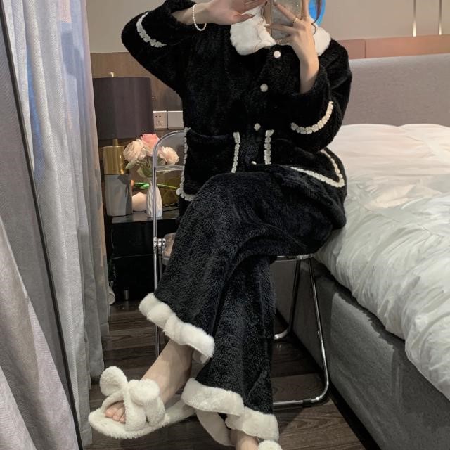 Small fragrant wind warm home Suit Suit Tide Thickening Splicing Coral Fleece Autumn Winter Retro Woolen Suede Sleeping Clothes Two Sets-Taobao