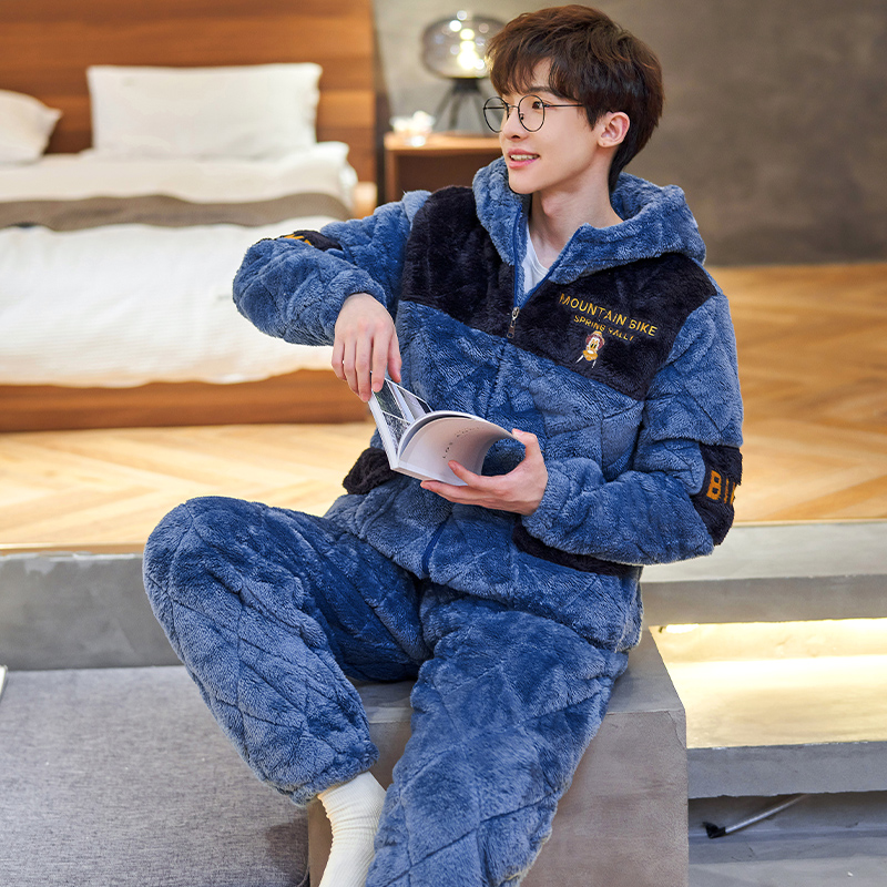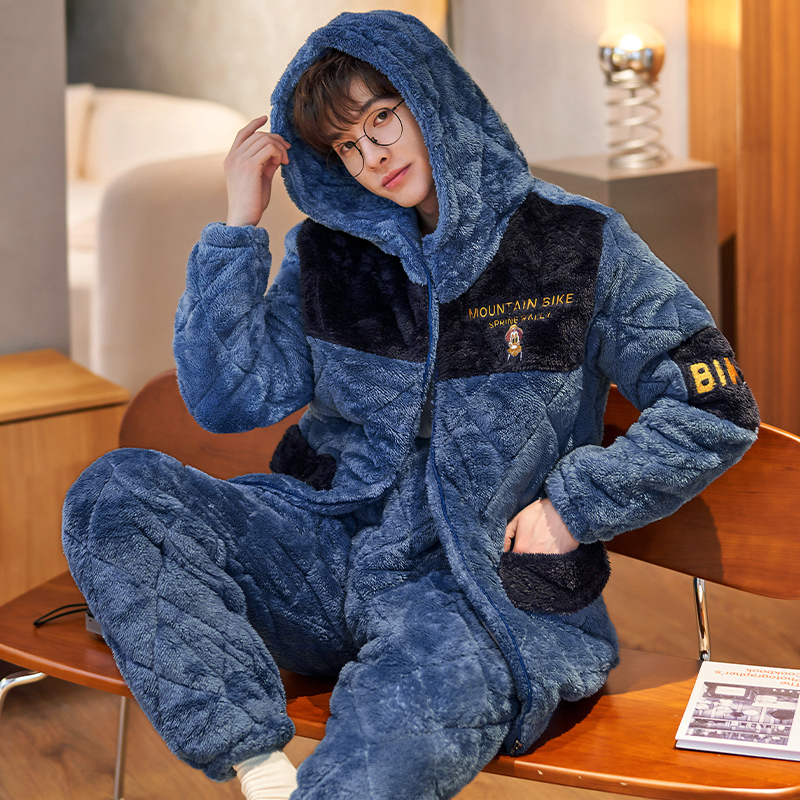 Pajamas men thicken in winter heating coral velvet super thick three layers of cotton large size zip home clothes in winter
