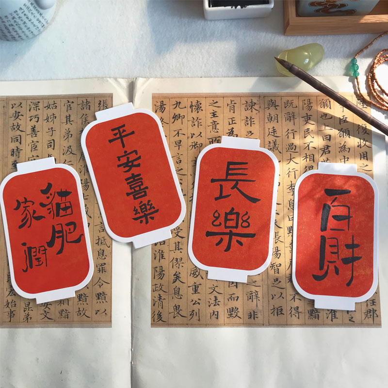 Gold-plated horizontal rabbit (upper and lower 2 holes), one gold-plated vertical rabbit (upper and lower 2 holes), one Ruyi (upper 1 hole), one round lantern (upper and lower 2 holes), one Chinese knot lanyard (5 pieces), red blessing