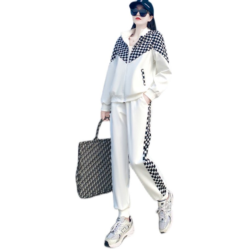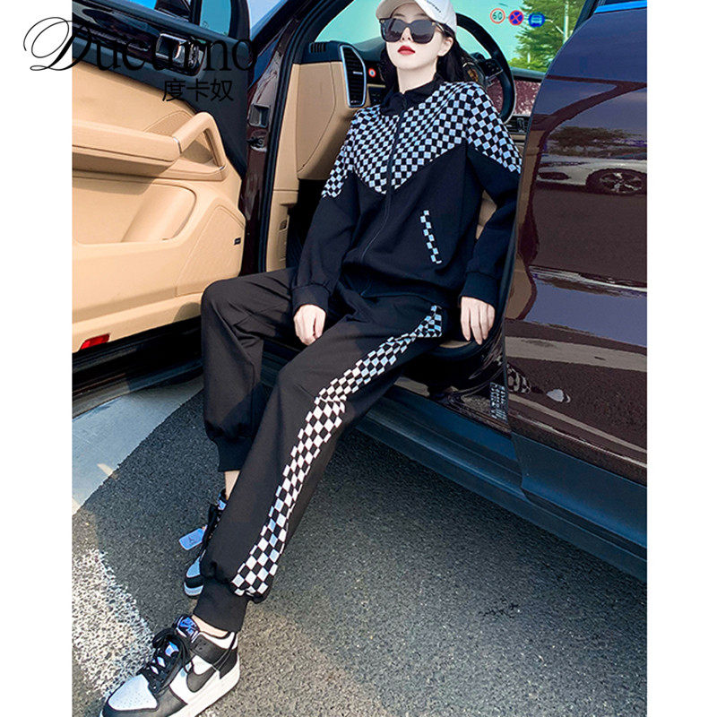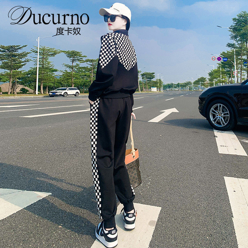 Ducurno autumn and winter new fashion casual sportswear suit age-reducing plaid loose sweater sweater two-piece set