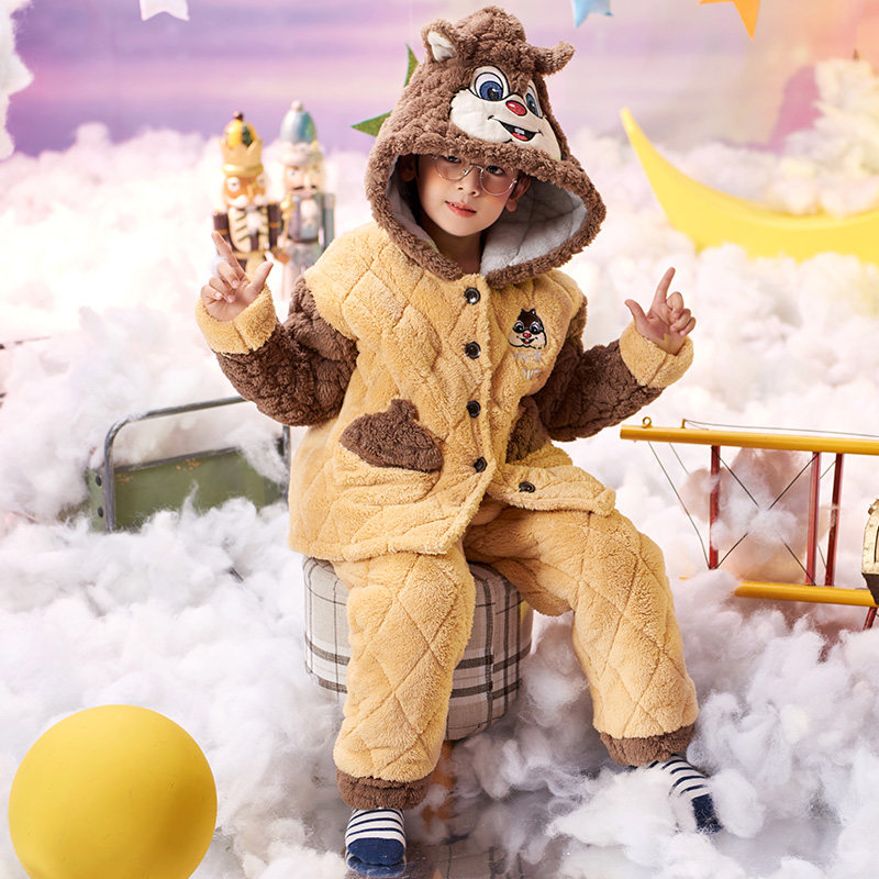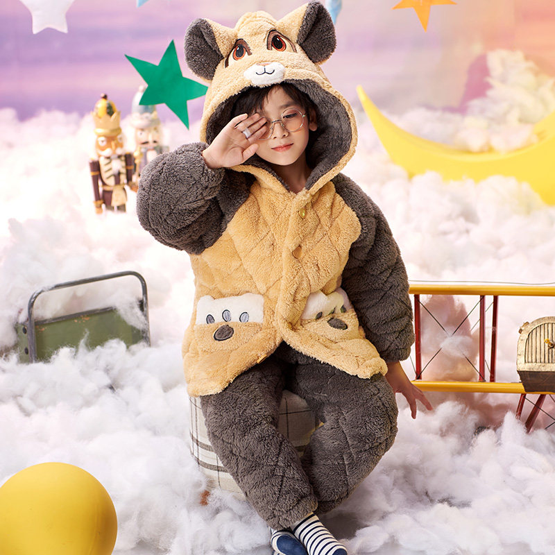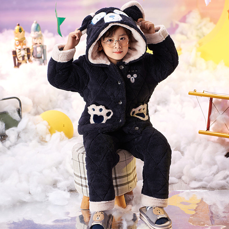 Boy's pyjamas thickened Coral Suede Cute Cartoon Small Bear Vini Triple Clip Cotton Children's Home Suit Winter