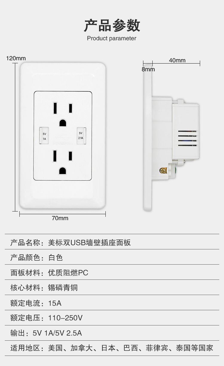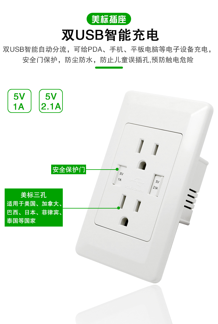 118-type American six-hole with dual USB socket 15A US regulation 110 Taiwan American mobile phone charging plug 2 1A US