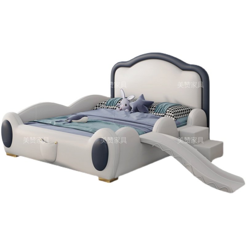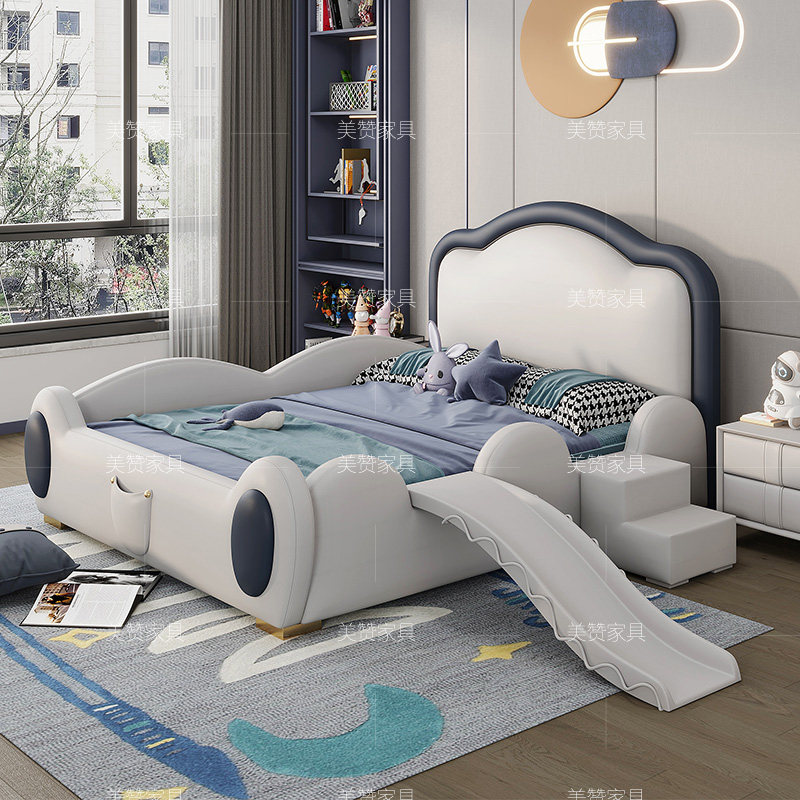 Light luxury leather children's bed boy solid wood girl princess bed modern minimalist youth single slide with guardrail