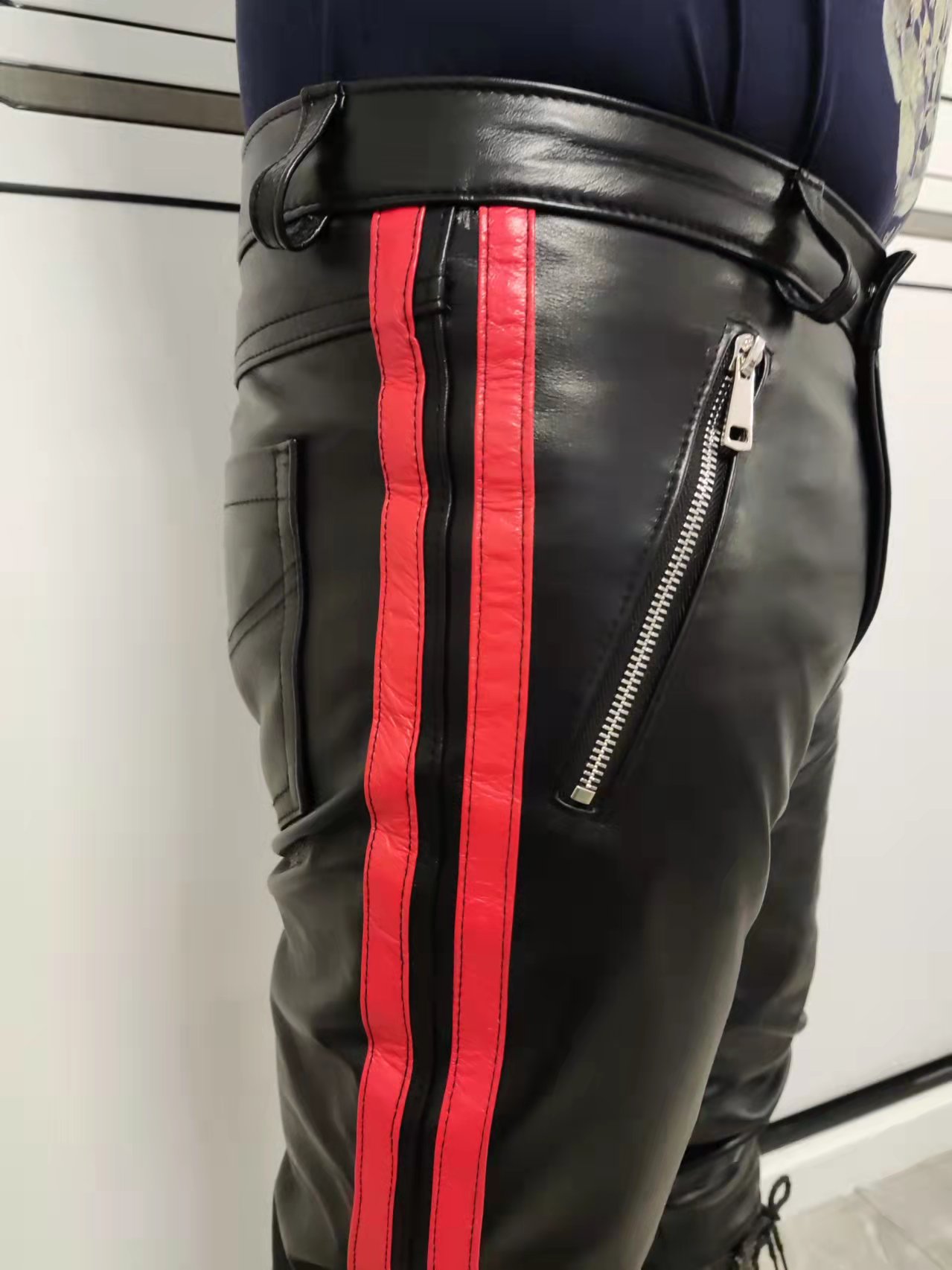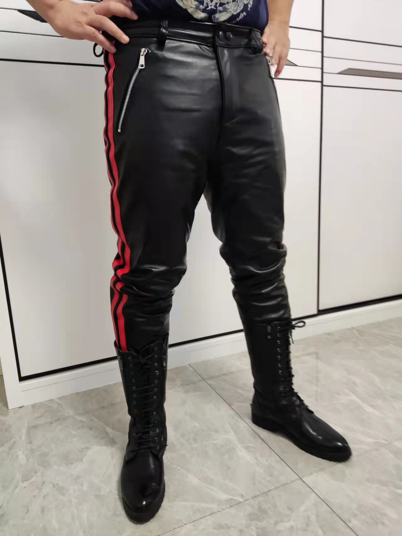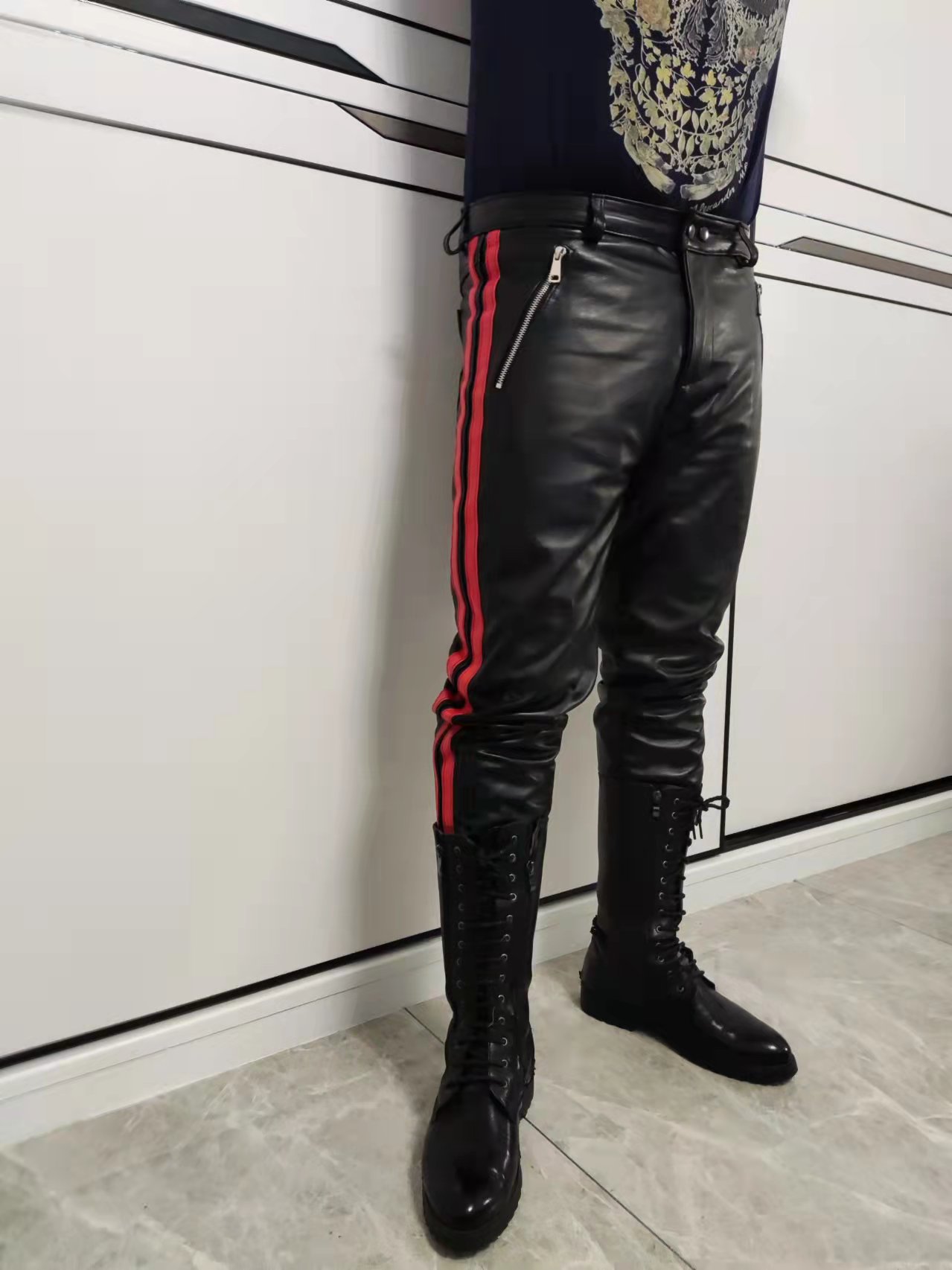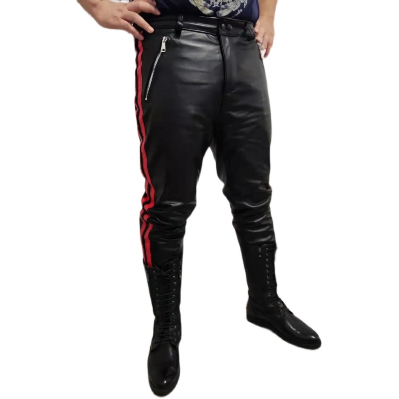 High-end custom bicoloured bar headlayer calf leather calf leather pants with small feet stylish and warm genuine leather pants man