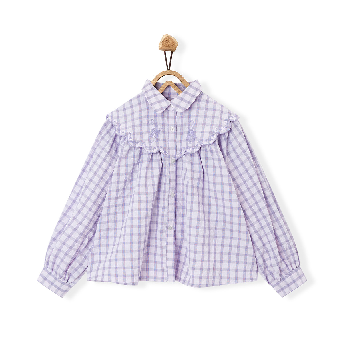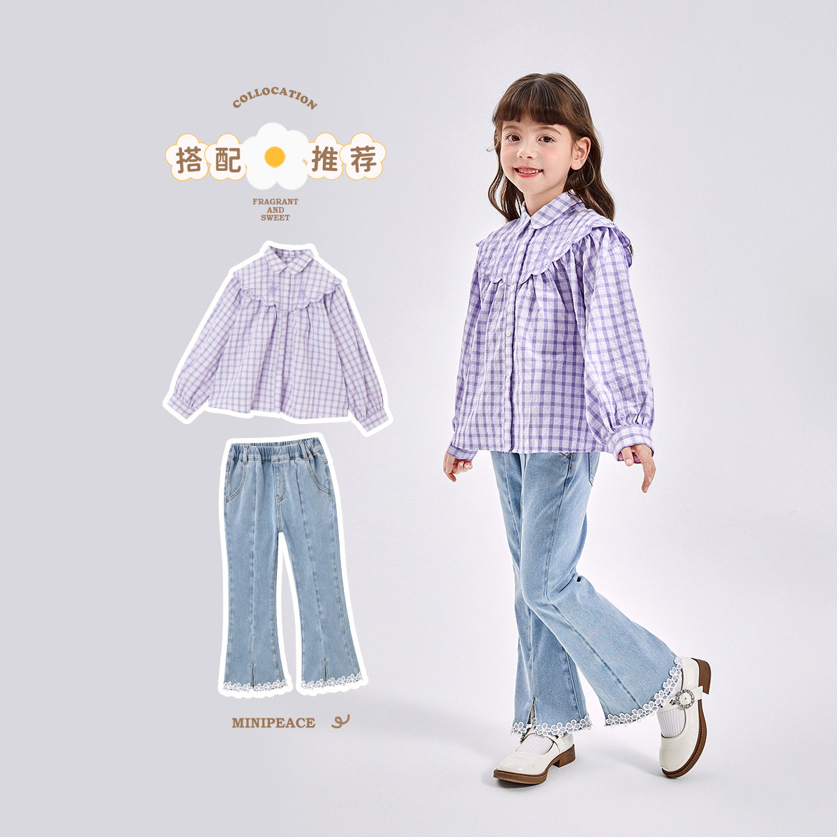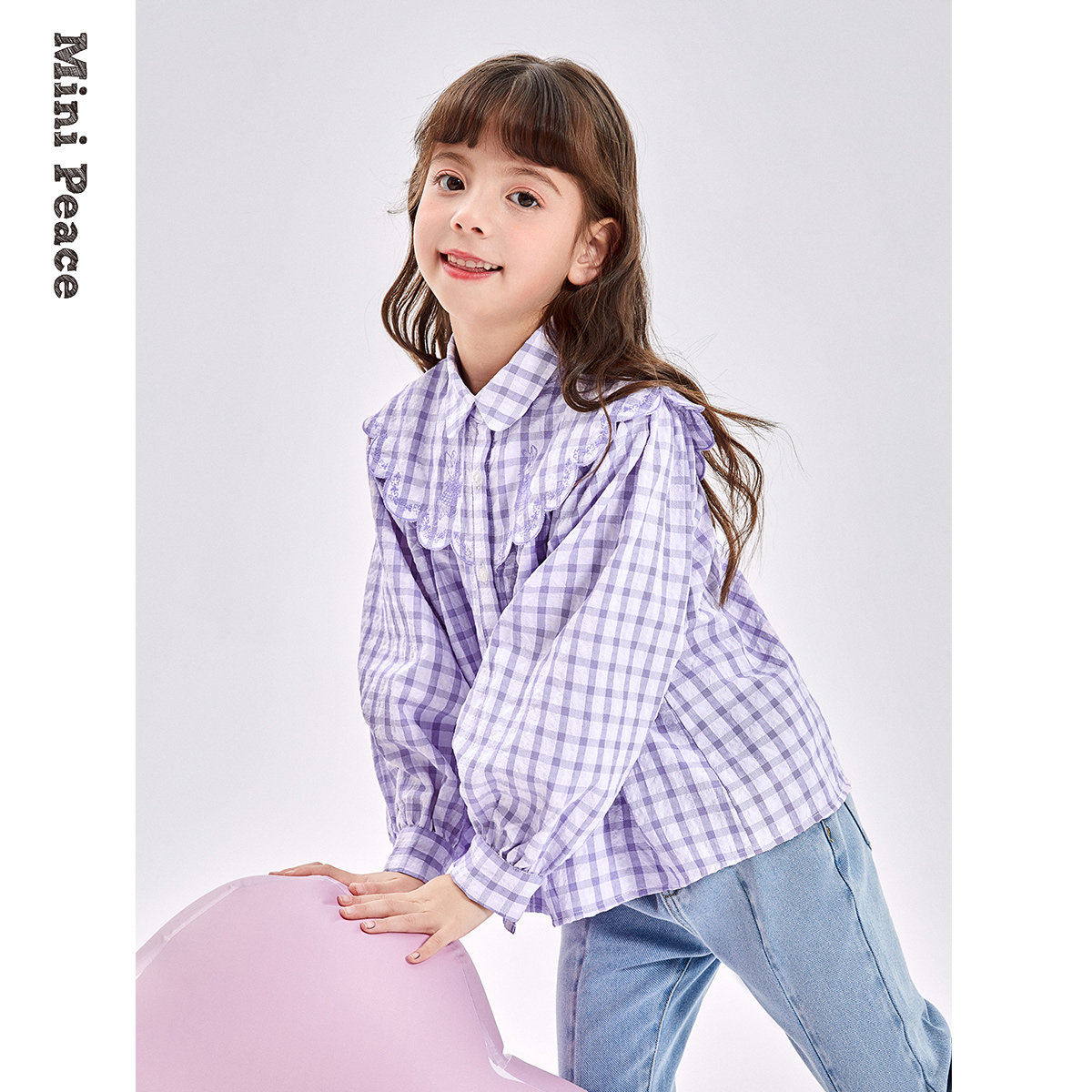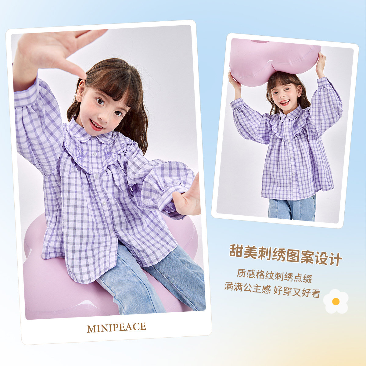 minipeace Taiping bird children Girl Purple Gust Shirt Spring New National Wind Lace Embroidered Shirt