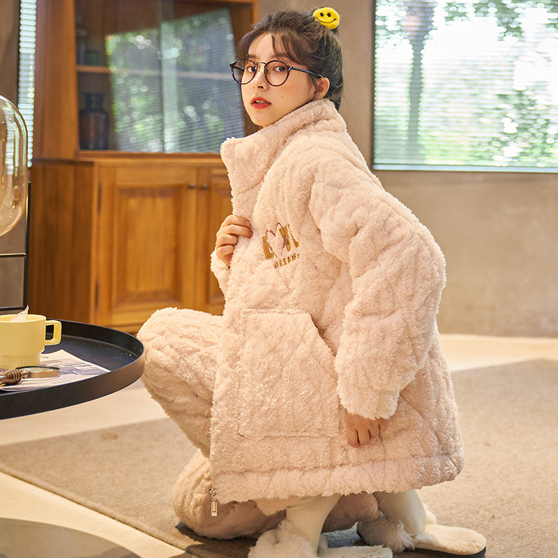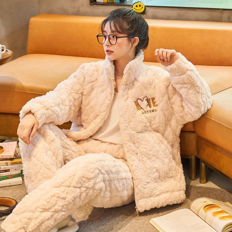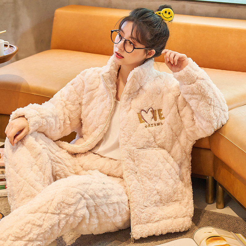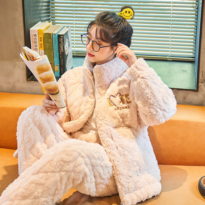 Famous Yuan Xiaoxiang Wind ~ Heavy Industry Delicate Pyjamas Women Winter Cute Coral Suede Clip Cotton Triple thickened Home Thickened Furniture