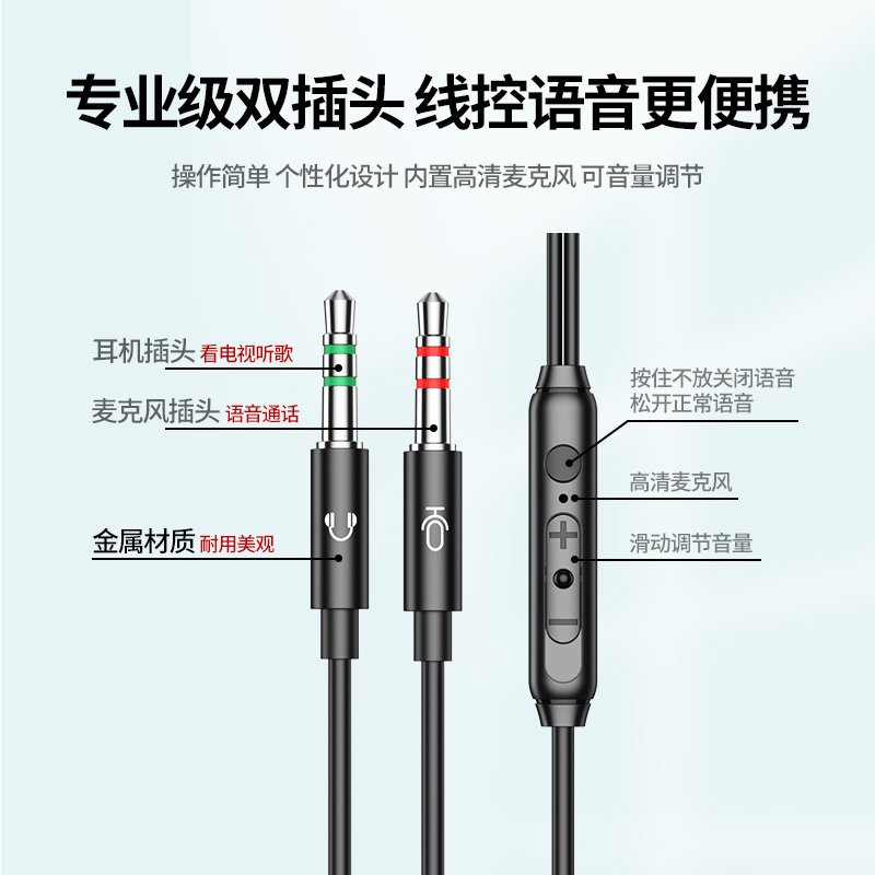 Computer headset wired with microphone in-ear e-sports eating chicken game earplugs special desktop two-in-one 2m 3m extension line notebook anchor live broadcast monitoring microphone dual-hole plug