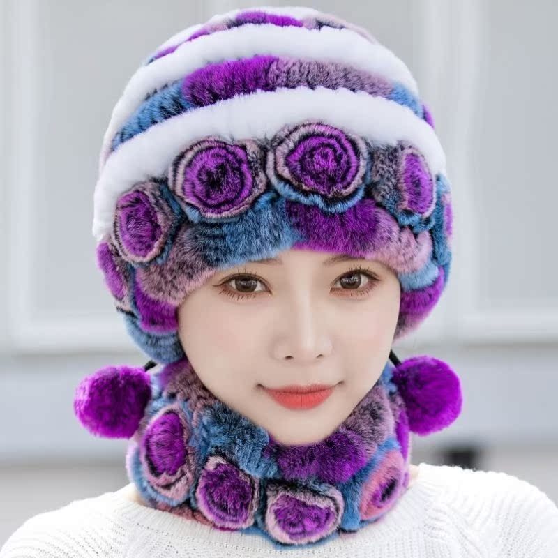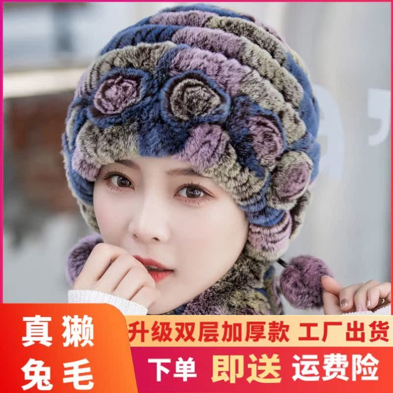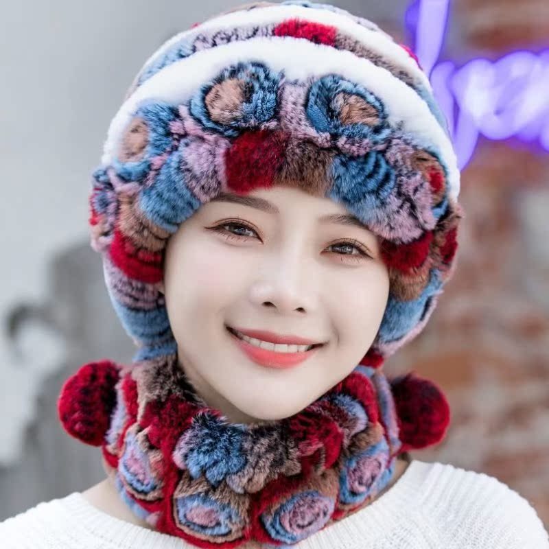 New Rex rabbit fur hat flower type autumn and winter thickening mother hat women's real rabbit fur hat neck sleeve set