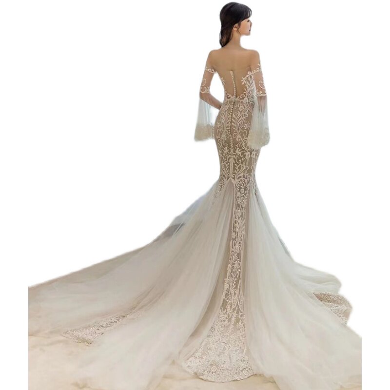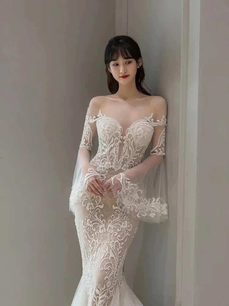 Fan-style light wedding dress 2021 new bridal brief male main wind fish tail small crowdsourced wedding gown dress long sleeves