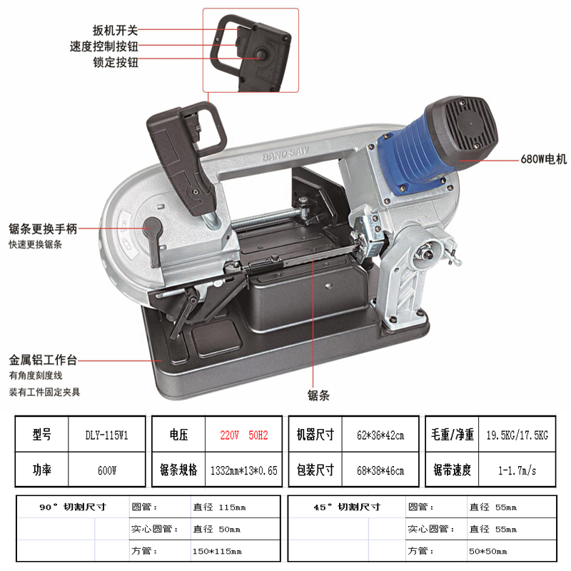 Taiwan small sawing machine 115W1 aluminum copper tube steel cable horizontal cutting machine Pepsi small band sawing machine