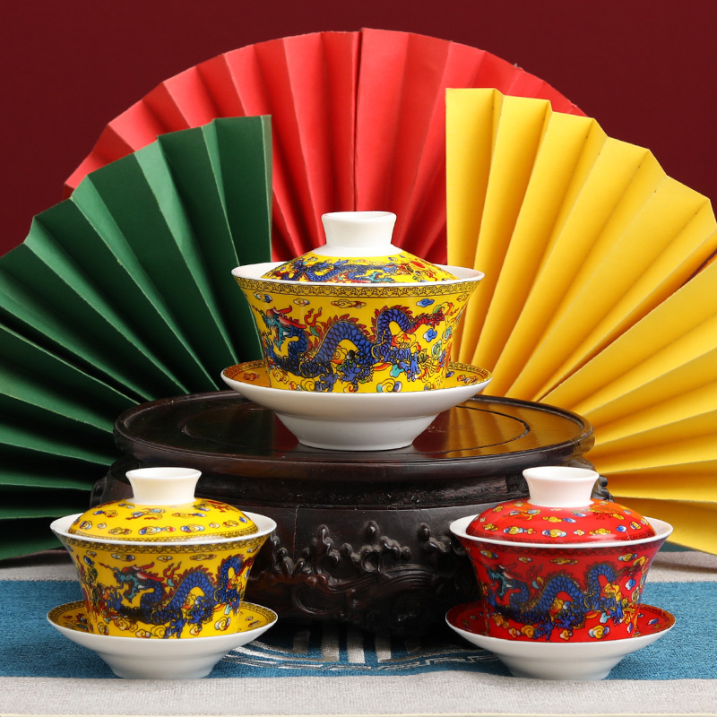 Small red-glazed dragon-patterned cover bowlSmall yellow-glazed dragon-patterned cover bowlMedium yellow-glazed dragon pattern cover bowlClassic blue and white 200ml Blossoms and riches 200ml Red peony 200ml Yellow glaze 200ml gold