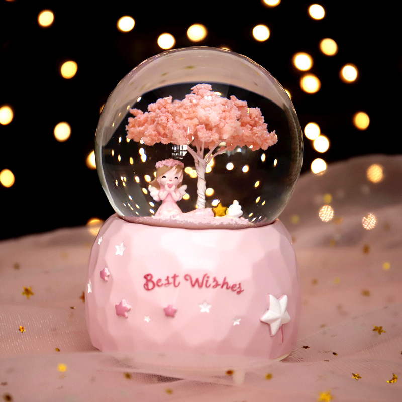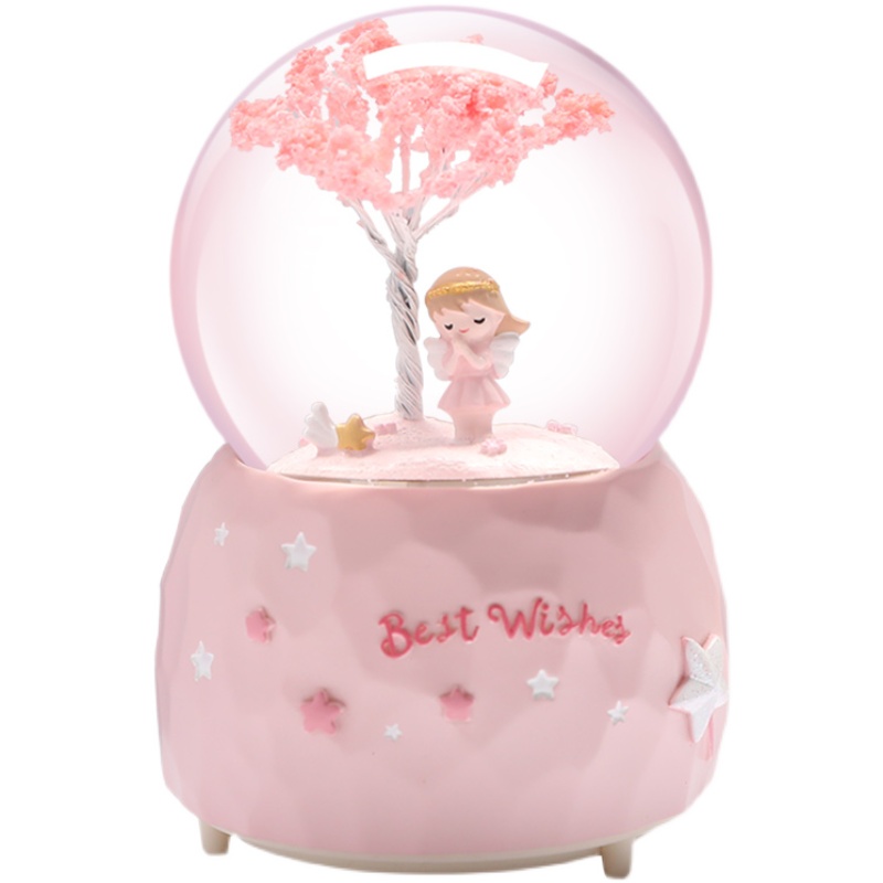 Fantasy Cherry Blossom Crystal Ball Music Box Snowflake Angel Dancing Girl Rotating Music Box Night Light Girls Birthday Gift