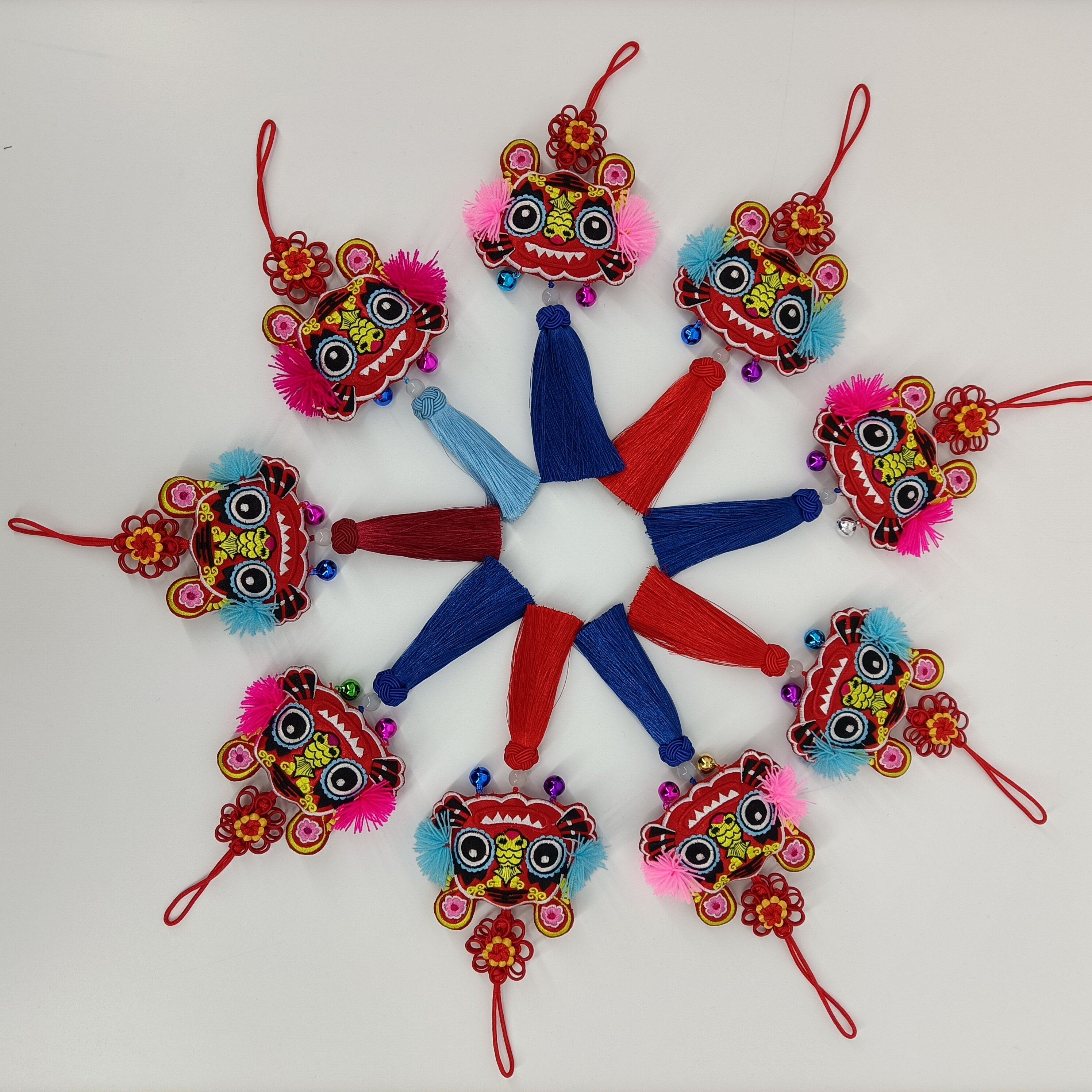 Red (joy tiger) pink (lucky bag) purple (lucky bag) red (dragon pendant) royal blue (dragon pendant) bright yellow (safe gourd)