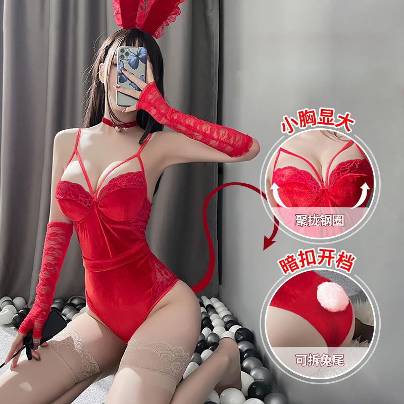 Black ears, clothes, tail, bells, red ears, clothes, tails, bells, black rabbit suit, fishnet stockings (no gloves), black rabbit suit, stockings (no gloves), red rabbit suit