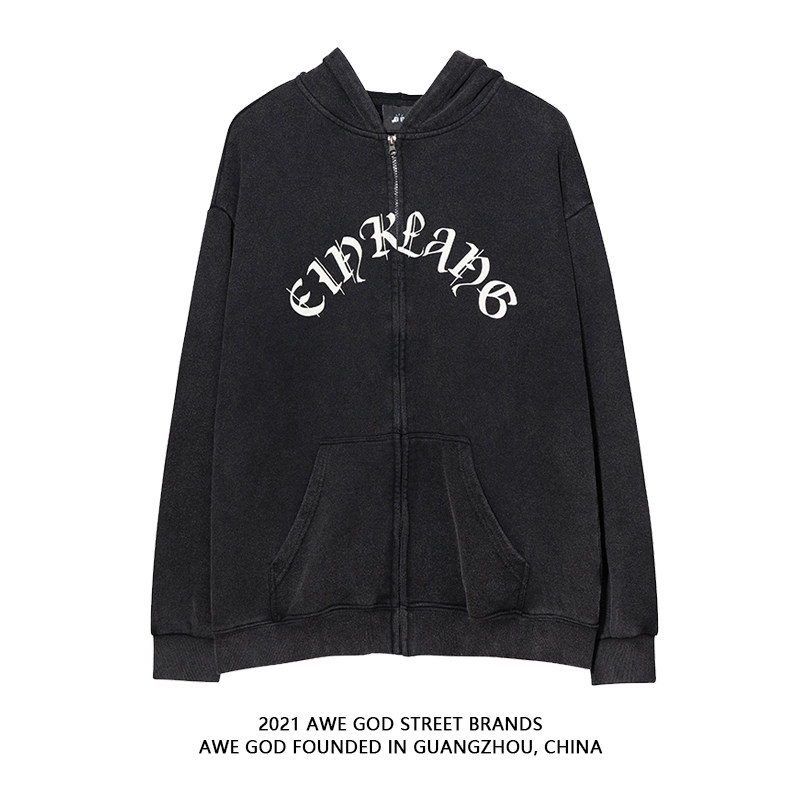 AWE GOD American retro old washed hooded cardigan plus fleece sweater men's and women's autumn and winter loose ins tide jacket