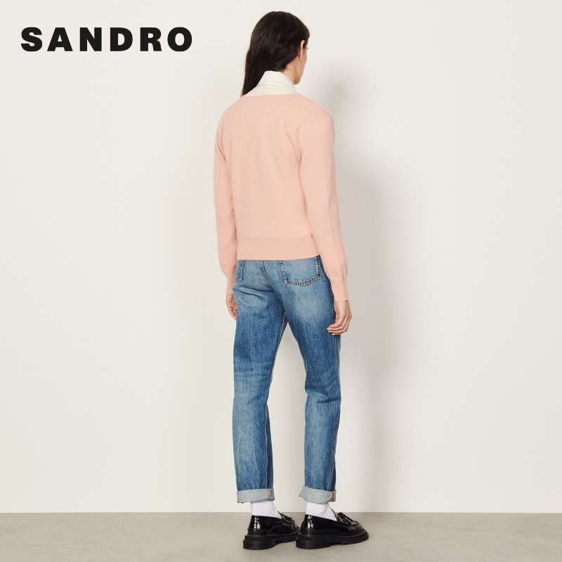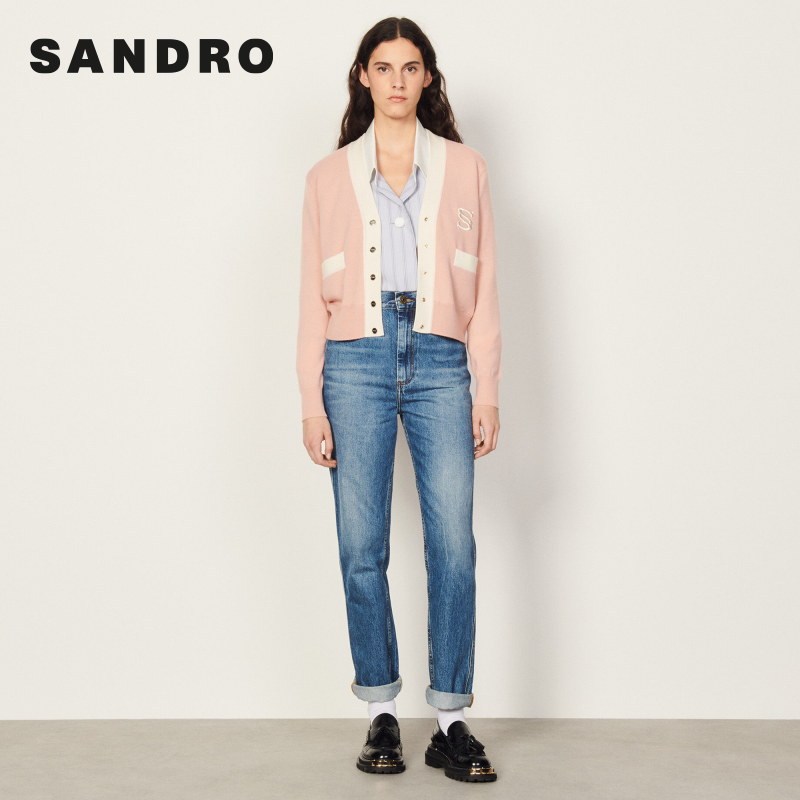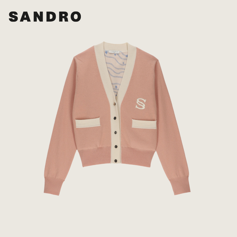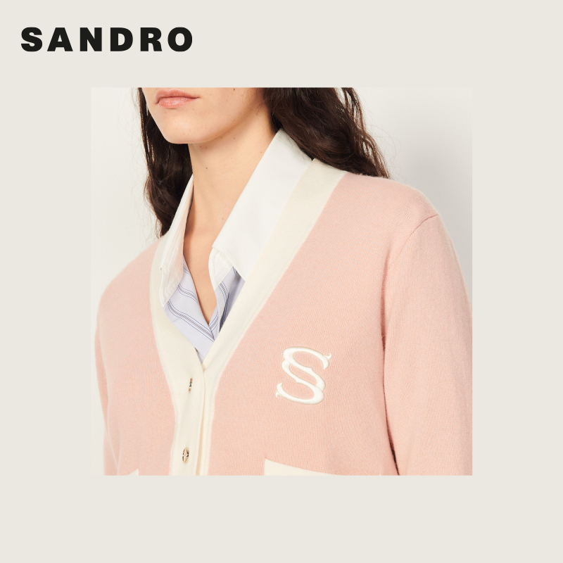 (Blogger with the same paragraph) sandro2022 spring new female light pink contrast color V-neck knitted cardigan SFPCA00570