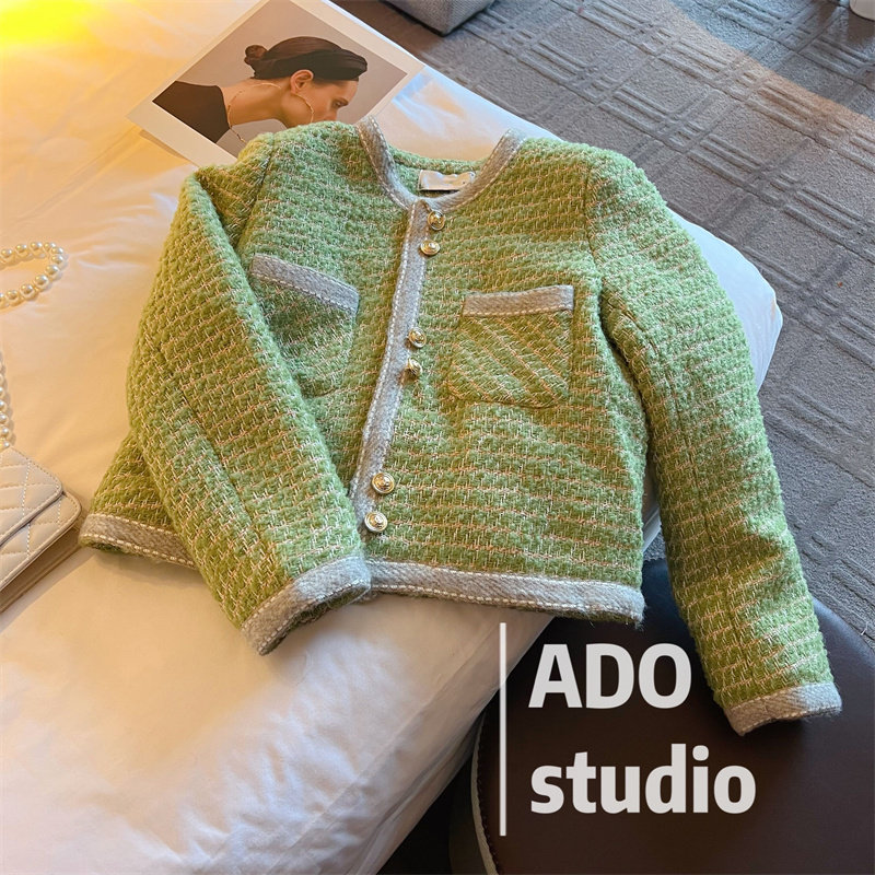 Green small fragrant wind tweed down jacket women's 2022 spring new temperament ladies plus velvet short jacket