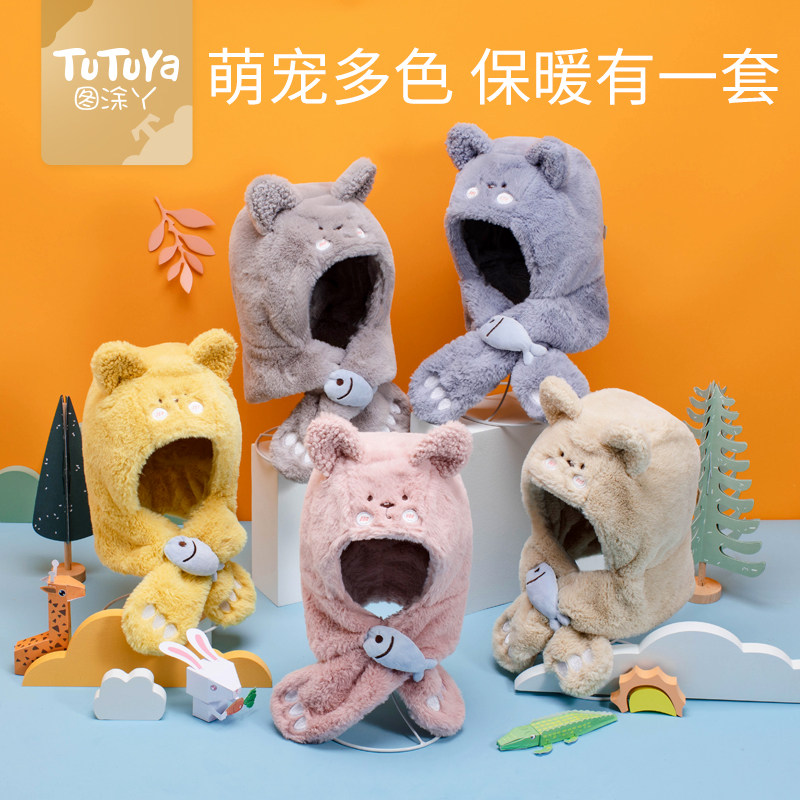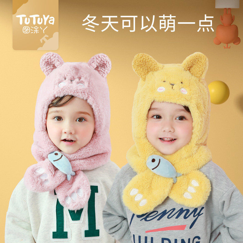 Winter children's hat scarf gloves one piece hat boys and girls plus fleece ear protector hat thick warm cute super cute