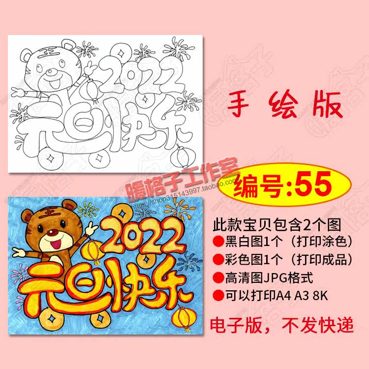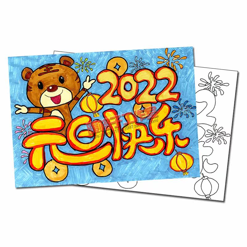 2022 New Year's Day Happy poster template Primary school students greet New Year's Tiger children's painting hand-painted electronic version