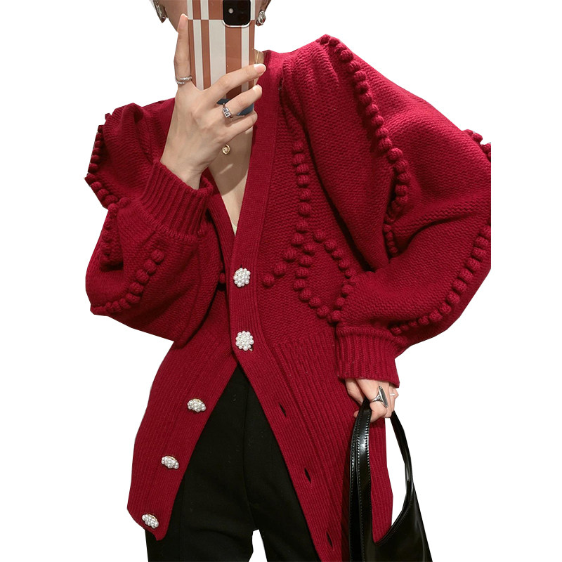 Pearl buckle handmade ball ball knit cardigan women's winter thickened age-old style red sweater jacket