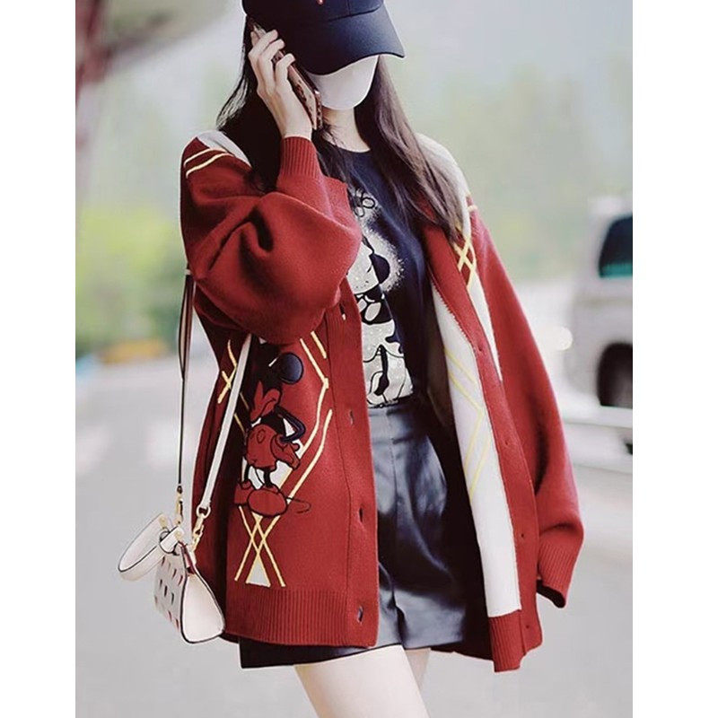 Yang Lingqing star with the diangg red Mickey sweater 2022 autumn and winter Christmas v collar medium coat coat