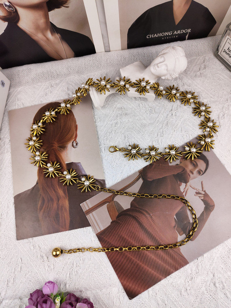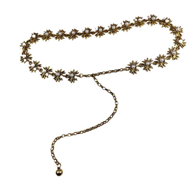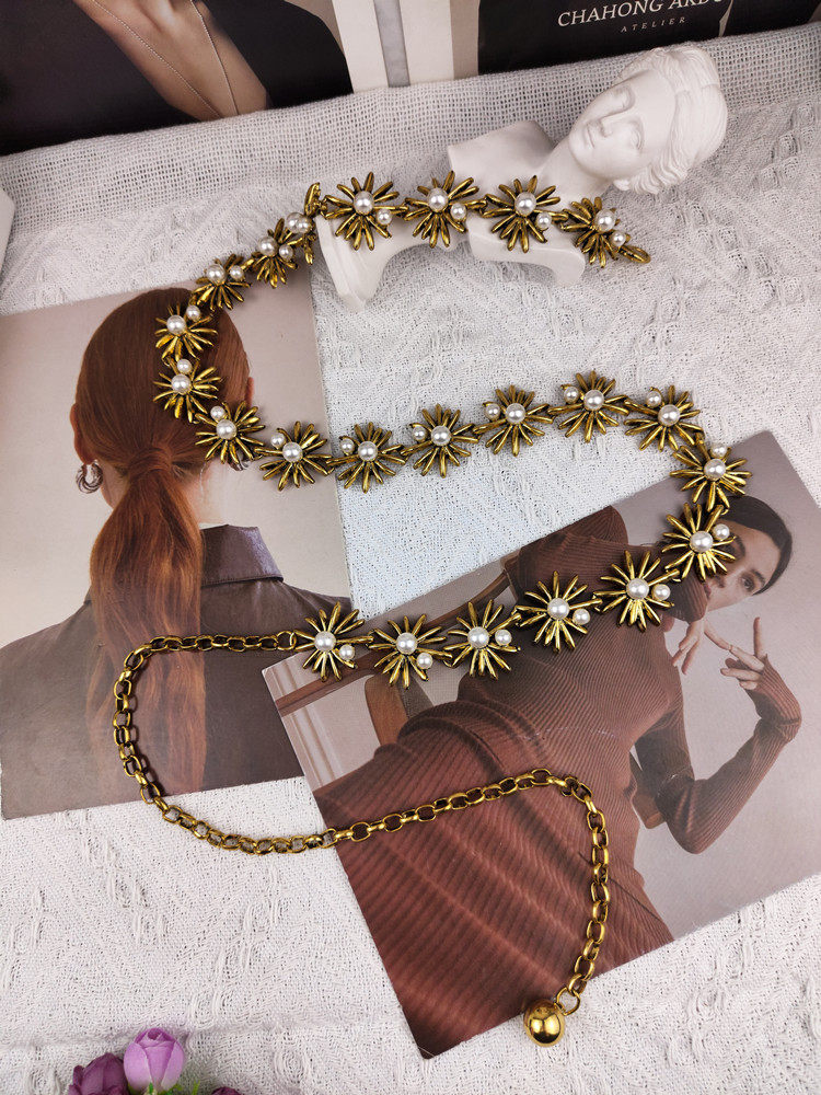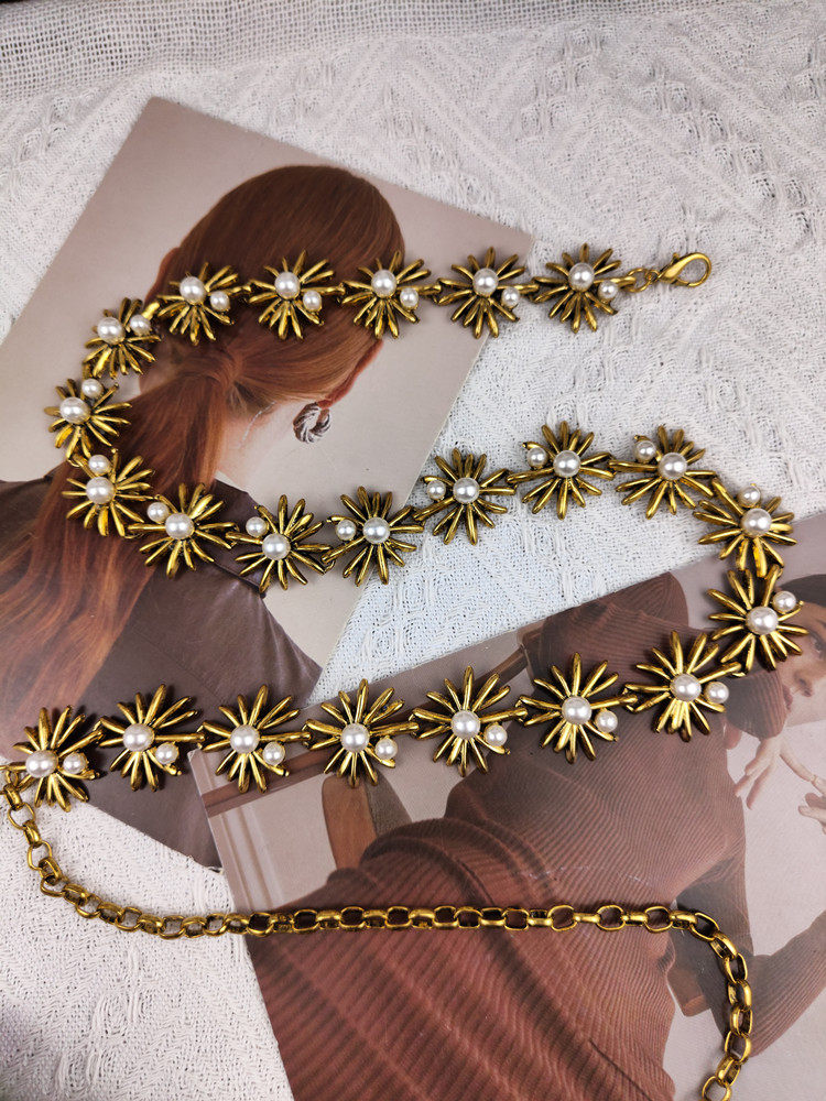 Gold inlaid pearl waist chain in ancient bronze gold