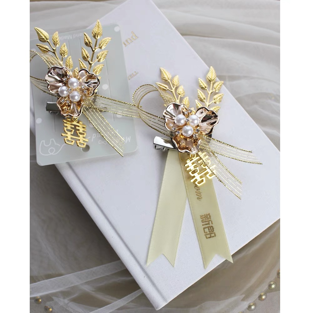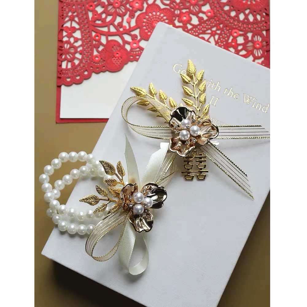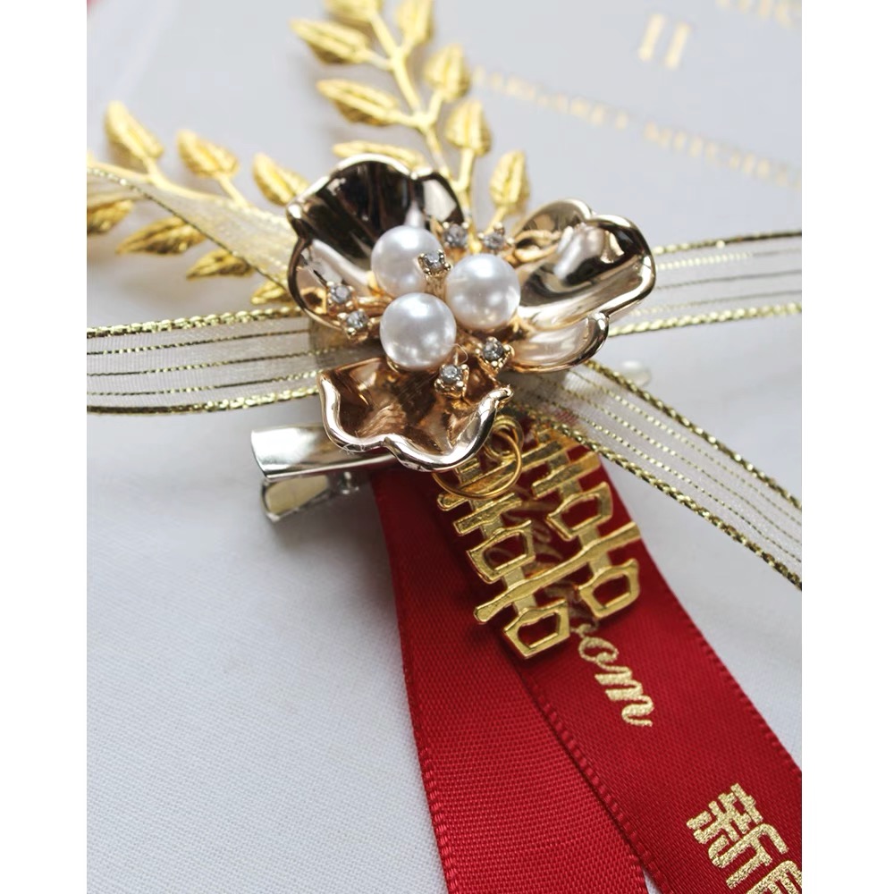 Pearl hand florist red chest flower (groom) red chest flower (father) red brooch (mother) red chest flower (bridegroom) red chest flower (bridesmaid) champagne corset (bridegroom)