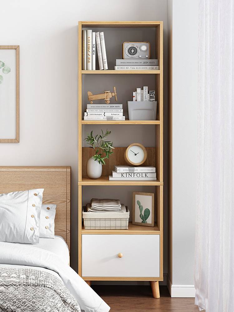 The shelf next to the sofa in the living room, the bookcase, the bookshelf, the floor-to-ceiling corner, the creative long and narrow cabinet, the long bar against the wall