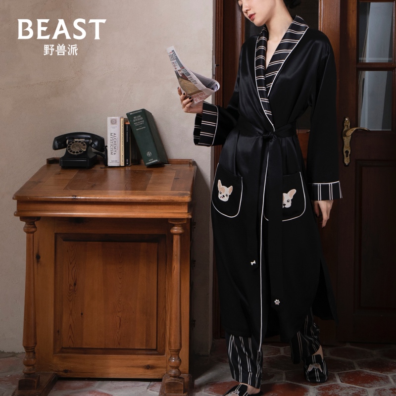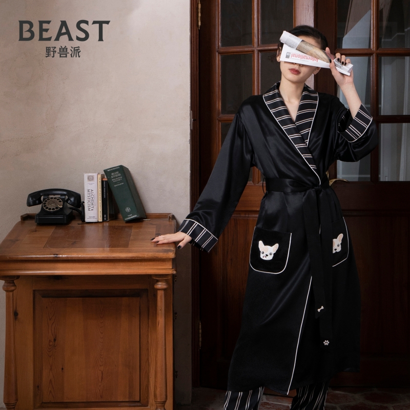 THEBEAST wild beasts "Day in a fight gold" small milky dog black striped printed 22 mmi true silk sleeping robe
